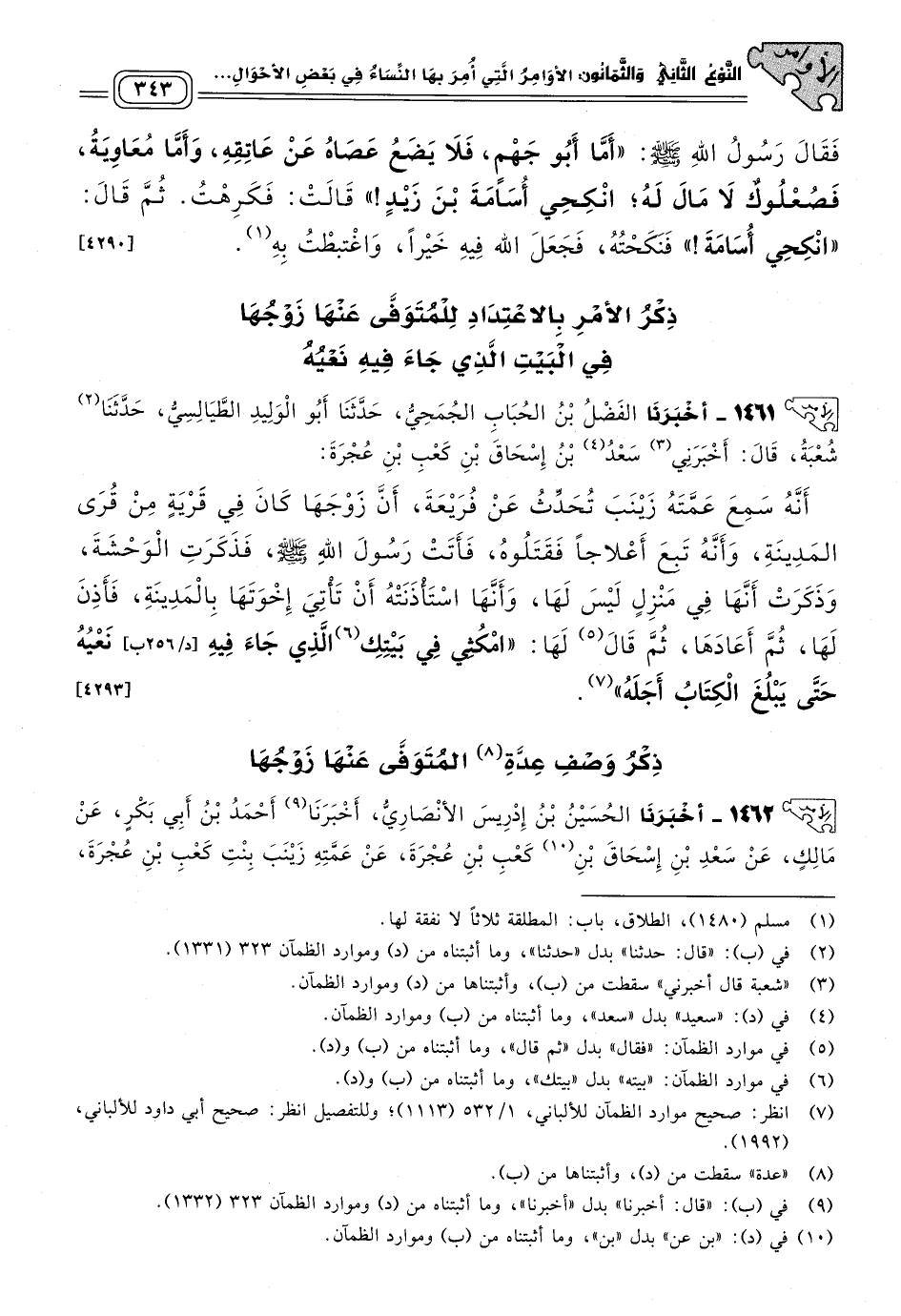 ١٤٦١ - أَخبَرنا الْفَضْلُ بْنُ الْحُبَابِ الْجُمَحِيُّ، حَدثنا أَبُو الْوَلِيدِ الطَّيَالِسِيُّ، حَدثنا شُعْبَةُ، قَالَ: أَخْبَرَنِي سَعْدُ بْنُ إِسْحَاقَ بْنِ كَعْبِ بْنِ عُجْرَةَ، أَنَّهُ سَمِعَ عَمَّتَهُ زَيْنَبَ، تُحَدِّثُ عَنْ فُرَيْعَةَ، أَنَّ زَوْجَهَا كَانَ فِي قَرْيَةٍ مِنْ قُرَى الْمَدِينَةِ، وَأَنَّهُ تَبِعَ أَعْلَاجًا، فَقَتَلُوهُ، فَأَتَتْ رَسُولَ اللهِ صَلى الله عَلَيه وسَلم فَذَكَرَتِ الْوَحْشَةَ، وَذَكَرَتْ أَنَّهَا فِي مَنْزِلٍ لَيْسَ لَهَا، وَأَنَّهَا اسْتَأْذَنَتْهُ أَنْ تَأْتِيَ إِخْوَتَهَا بِالْمَدِينَةِ، فَأَذِنَ لَهَا، ثُمَّ أَعَادَهَا، ثُمَّ قَالَ لَهَا: "امْكُثِي فِي بَيْتِكِ الَّذِي جَاءَ فِيهِ نَعْيُهُ حَتَّى يَبْلُغَ الْكِتَابُ أَجَلَهُ". [٤٢٩٣]