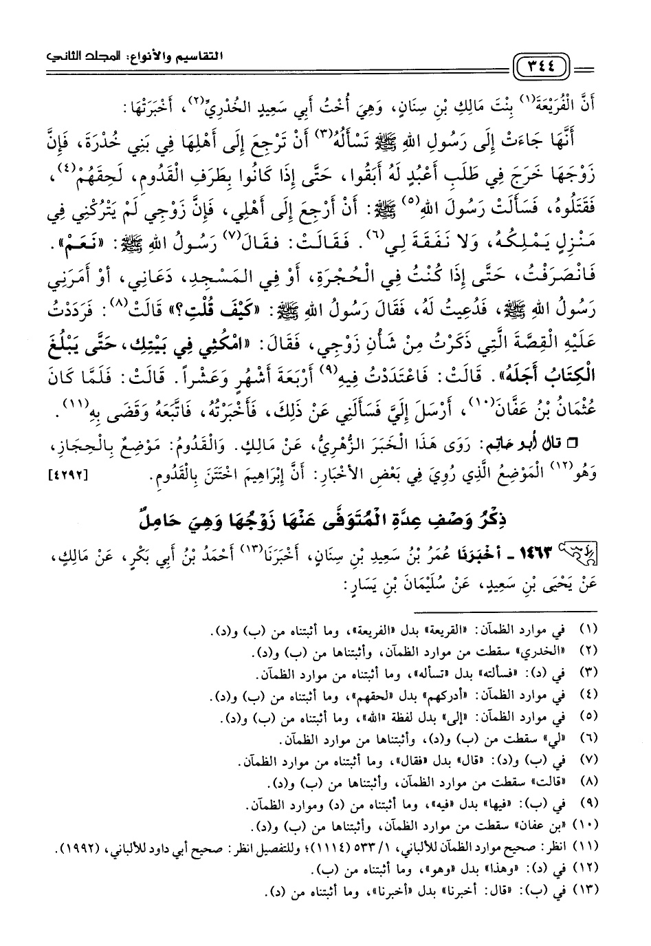 ١٤٦٣ - أَخبَرنا عُمَرُ بْنُ سَعِيدِ بْنِ سِنَانٍ، أَخبَرنا أَحْمَدُ بْنُ أَبِي بَكْرٍ، عَنْ مَالِكٍ، عَنْ يَحْيَى بْنِ سَعِيدٍ، عَنْ سُلَيْمَانَ بْنِ يَسَارٍ، أَنَّ عَبْدَ اللهِ بْنَ عَبَّاسٍ وَأَبَا سَلَمَةَ بْنِ عَبْدِ الرَّحْمَنِ اخْتَلَفَا فِي الْمَرْأَةِ تَنْفَسُ بَعْدَ وَفَاةِ زَوْجِهَا بِلَيَالٍ، فَقَالَ عَبْدُ اللهِ: آخِرَ الأَجَلَيْنِ، وَقَالَ أَبُو سَلَمَةَ: إِذَا نُفِسَتْ فَقَدْ حَلَّتْ، قَالَ: فَجَاءَ أَبُو هُرَيْرَةَ فَقَالَ: أَنَا مَعَ ابْنِ أَخِي، يَعْنِي أَبَا سَلَمَةَ، فَبَعَثُوا كُرَيْبًا مَوْلَى ابْنِ عَبَّاسٍ إِلَى أُمِّ سَلَمَةَ، زَوْجِ النَّبِيِّ صَلى الله عَلَيه وسَلم، فَسَأَلَهَا عَنْ ذَلِكَ، فَجَاءَهُمْ، فَأَخْبَرَهُمْ أَنَّهَا قَالَتْ: وَلَدَتْ سُبَيْعَةُ الأَسْلَمِيَّةُ بَعْدَ وَفَاةِ زَوْجِهَا بِلَيَالٍ، فَذَكَرَتْ ذَلِكَ لِرَسُولِ اللهِ صَلى الله عَلَيه وسَلم، فَقَالَ لَهَا: "قَدْ حَلَلْتِ فَانْكِحِي". [٤٢٩٦]