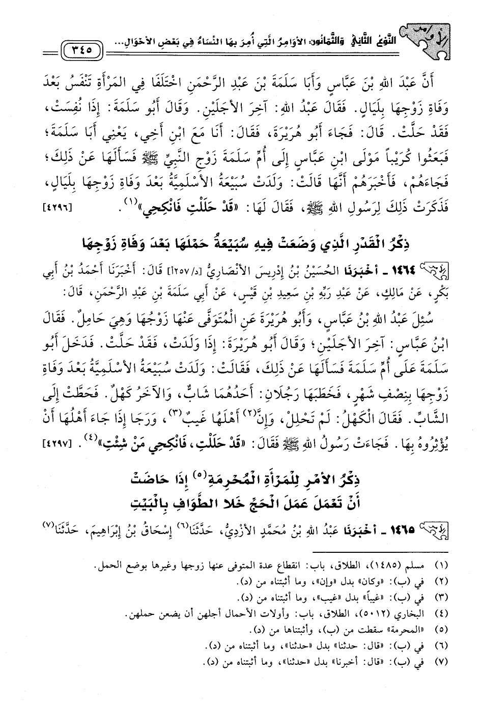 ١٤٦٤ - أَخبَرنا الْحُسَيْنُ بْنُ إِدْرِيسَ الأَنْصَارِيُّ، قَالَ: أَخبَرنا أَحْمَدُ بْنُ أَبِي بَكْرٍ، عَنْ مَالِكٍ، عَنْ عَبْدِ رَبِّهِ بْنِ سَعِيدِ بْنِ قَيْسٍ، عَنْ أَبِي سَلَمَةَ بْنِ عَبْدِ الرَّحْمَنِ قَالَ: سُئِلَ عَبْدُ اللهِ بْنُ عَبَّاسٍ وَأَبُو هُرَيْرَةَ عَنِ الْمُتَوَفَّى عَنْهَا زَوْجُهَا وَهِيَ حَامِلٌ، فَقَالَ ابْنُ عَبَّاسٍ: آخِرَ الأَجَلَيْنِ، وَقَالَ أَبُو هُرَيْرَةَ: إِذَا وَلَدَتْ فَقَدْ حَلَّتْ، فَدَخَلَ أَبُو سَلَمَةَ عَلَى أُمِّ سَلَمَةَ، فَسَأَلَهَا عَنْ ذَلِكَ، فَقَالَتْ: وَلَدَتْ سُبَيْعَةُ الأَسْلَمِيَّةُ بَعْدَ وَفَاةِ زَوْجِهَا بِنِصْفِ شَهْرٍ، فَخَطَبَهَا رَجُلَانِ أَحَدُهُمَا شَابٌّ، وَالآخَرُ كَهْلٌ، فَحَطَّتْ إِلَى الشَّابِّ، فَقَالَ الْكَهْلُ: لَمْ تَحْلِلْ، وإن أَهْلَهَا غَيْبٌ وَرَجَا إِذَا جَاءَ أَهْلُهَا أَنْ يُؤْثِرُوهُ بِهَا، فَجَاءَتْ رَسُولَ اللهِ صَلى الله عَلَيه وسَلم، فَقَالَ: "قَدْ حَلَلْتِ فَانْكِحِي مَنْ شِئْتِ". [٤٢٩٧]