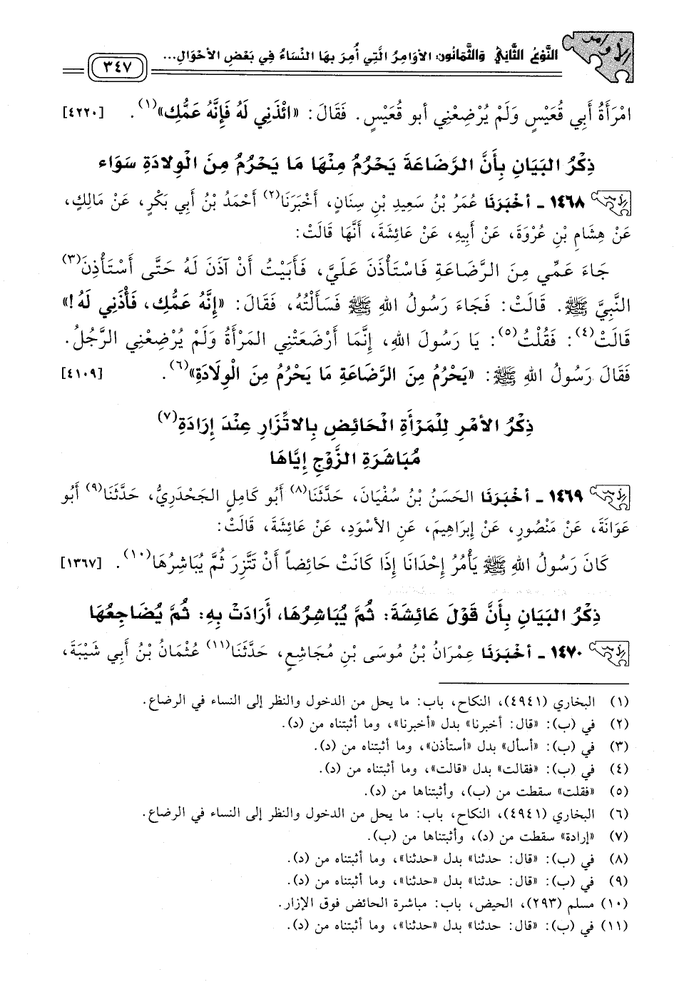 ١٤٧٠ - أَخبَرنا عِمْرَانُ بْنُ مُوسَى بْنِ مُجَاشِعٍ، حَدثنا عُثْمَانُ بْنُ أَبِي شَيْبَةَ، حَدثنا أَبُو مُعَاوِيَةَ، عَنِ الشَّيْبَانِيِّ، عَنْ عَبْدِ اللهِ بْنِ شَدَّادٍ، عَنْ عَائِشَةَ، قَالَتْ: كَانَ رَسُولُ اللهِ صَلى الله عَلَيه وسَلم إِذَا أَرَادَ أَنْ يُضَاجِعُ بَعْضَ نِسَائِهِ وَهِيَ حَائِضٌ أَمَرَهَا فَاتَّزَرَتْ. [١٣٦٨]