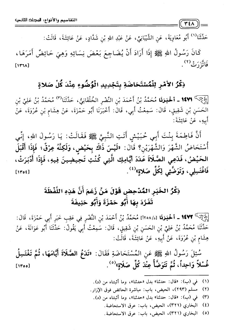 ١٤٧١ - أَخبَرنا مُحَمَّدُ بْنُ أَحْمَدَ بْنِ النَّضْرِ الْخُلْقَانِيُّ، حَدثنا مُحَمَّدُ بْنُ عَلِيِّ بْنِ الْحَسَنِ بْنِ شَقِيقٍ، قَالَ: سَمِعْتُ أَبِي، قَالَ: أَخبَرنا أَبُو حَمْزَةَ، عَنْ هِشَامِ بْنِ عُرْوَةَ، عَنْ أَبِيهِ، عَنْ عَائِشَةَ، أَنَّ فَاطِمَةَ بِنْتَ أَبِي حُبَيْشٍ، أَتَتِ النَّبِيَّ صَلى الله عَلَيه وسَلم، فَقَالَتْ: يَا رَسُولَ اللهِ، إِنِّي أُسْتَحَاضُ الشَّهْرَ وَالشَّهْرَيْنِ، قَالَ: "لَيْسَ ذَاكَ بِحَيْضٍ، وَلَكِنَّهُ عِرْقٌ، فَإِذَا أَقْبَلَ الْحَيْضُ، فَدَعِي الصَّلَاةَ عَدَدَ أَيَّامِكِ الَّتِي كُنْتِ تَحِيضِينَ فِيهِ، فَإِذَا أَدْبَرَتْ، فَاغْتَسِلِي، وَتَوَضَّئِي لِكُلِّ صَلَاةٍ". [١٣٥٤]