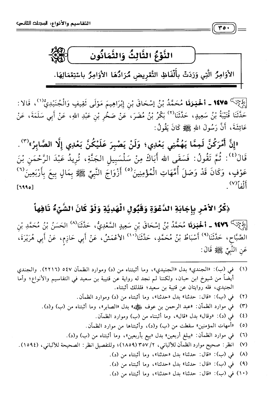 ١٤٧٥ - أَخبَرنا مُحَمَّدُ بْنُ إِسْحَاقَ بْنِ إِبْرَاهِيمَ، مَوْلَى ثَقِيفٍ، وَالْجُنَيدِيُّ، قَالَا: حَدثنا قُتَيْبَةُ بْنُ سَعِيدٍ، حَدثنا بَكْرُ بْنُ مُضَرَ، عَنْ صَخْرِ بْنِ عَبْدِ اللهِ، عَنْ أَبِي سَلَمَةَ، عَنْ عَائِشَةَ، أَنَّ رَسُولَ اللهِ صَلى الله عَلَيه وسَلم كَانَ يَقُولُ: "إِنَّ أَمْرَكُنَّ لَمِمَّا يَهُمُّنِي بَعْدِي، وَلَنْ يَصْبِرَ عَلَيْكُنَّ بَعْدِي إِلَاّ الصَّابِرُ"، قَالَ: ثُمَّ تَقُولُ: فَسَقَى اللهُ أَبَاكَ مِنْ سَلْسَبِيلِ الْجَنَّةِ، تُرِيدُ عَبْدَ الرَّحْمَنِ بْنَ عَوْفٍ، وَكَانَ قَدْ وَصَلَ أمهات المؤمنين أَزْوَاجَ النَّبِيِّ صَلى الله عَلَيه وسَلم بِمَالٍ بِيعَ بِأَرْبَعِينَ أَلْفًا. [٦٩٩٥]