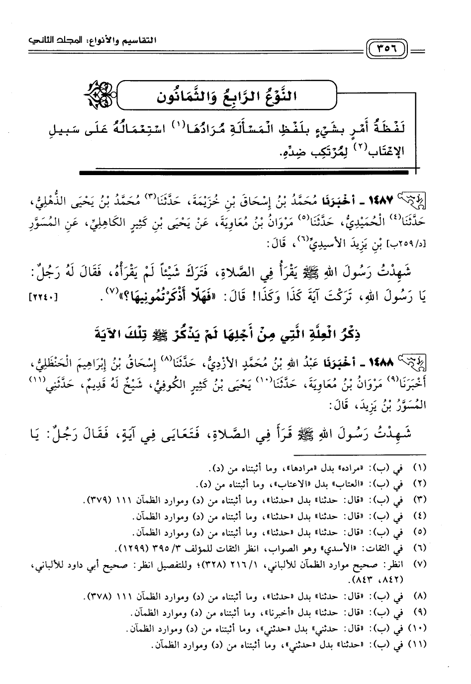 ١٤٨٧ - أَخبَرنا مُحَمَّدُ بْنُ إِسْحَاقَ بْنِ خُزَيْمَةَ، حَدثنا مُحَمَّدُ بْنُ يَحْيَى الذُّهْلِيُّ، حَدثنا الْحُمَيْدِيُّ، حَدثنا مَرْوَانُ بْنُ مُعَاوِيَةَ، عَنْ يَحْيَى بْنِ كَثِيرٍ الْكَاهِلِيِّ، عَنِ الْمُسَوَّرِ بْنِ يَزِيدَ الأَسِيدِيِّ، قَالَ: شَهِدْتُ رَسُولَ اللهِ صَلى الله عَلَيه وسَلم يَقْرَأُ فِي الصَّلَاةِ، فَتَرَكَ شَيْئًا لَمْ يَقْرَأْهُ، فَقَالَ لَهُ رَجُلٌ: يَا رَسُولَ اللهِ، تَرَكْتَ آيَةَ كَذَا وَكَذَا، قَالَ: "فَهَلَاّ أَذْكَرْتُمُونِيهَا". [٢٢٤٠]