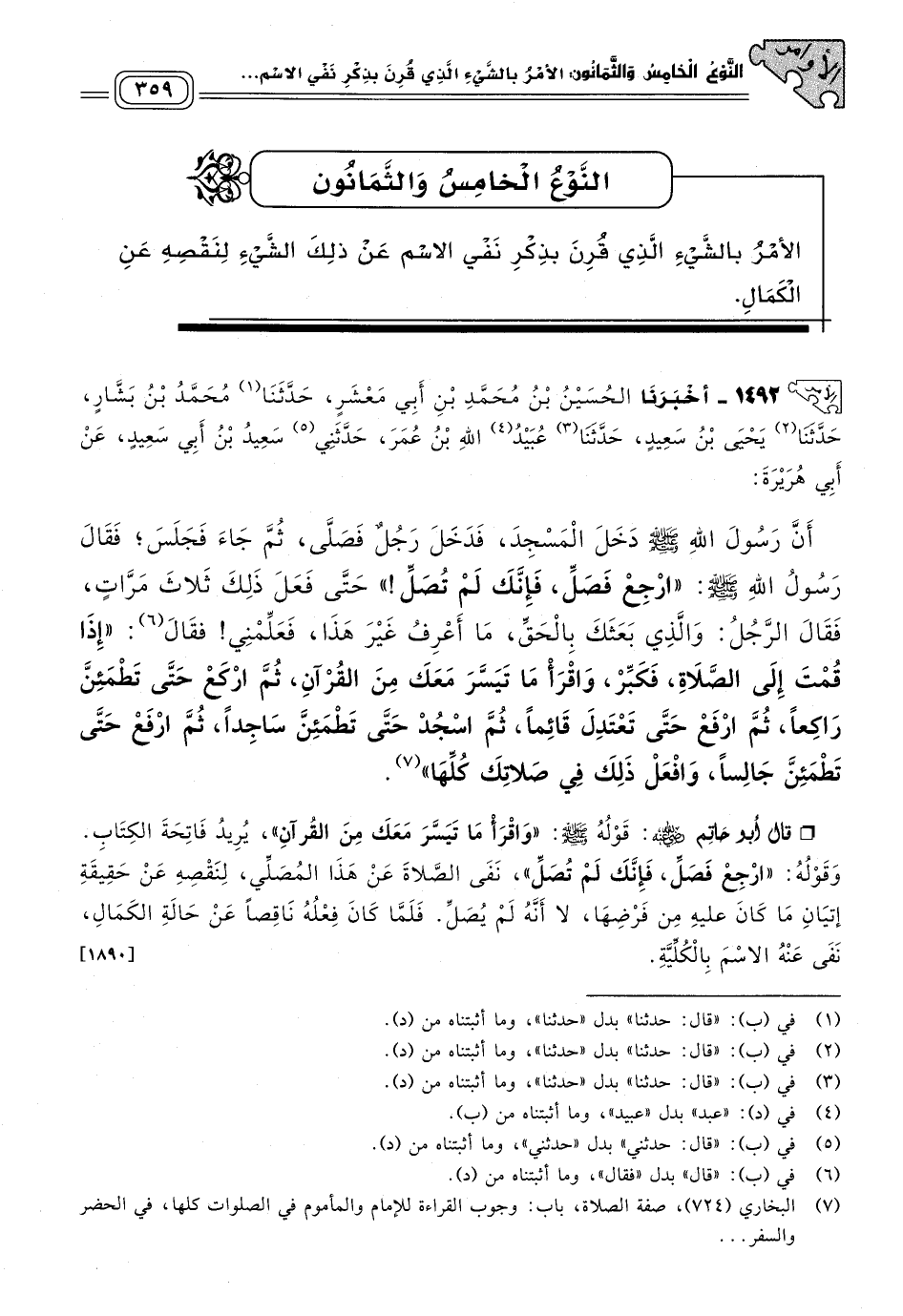 قَالَ أَبُو حَاتِمٍ رَضِيَ اللهُ عَنْهُ: قَوْلُهُ صَلى الله عَلَيه وسَلم: "وَاقْرَأْ مَا تَيَسَّرَ مَعَكَ مِنَ الْقُرْآنِ"، يُرِيدُ فَاتِحَةَ الْكِتَابِ، وَقَوْلُهُ: "ارْجِعْ فَصَلِّ، فَإِنَّكَ لَمْ تُصَلِّ"، نَفَى الصَّلَاةَ عَنْ هَذَا الْمُصَلِّي؛ لِنَقْصِهِ عَنْ حَقِيقَةِ إِتْيَانِ مَا كَانَ عَلَيْهِ مِنْ فَرْضِهَا، لَا أَنَّهُ لَمْ يُصَلِّ، فَلَمَّا كَانَ فِعْلُهُ نَاقِصًا عَنْ حَالَةِ الْكَمَالِ، نَفَى عَنْهُ الاِسْمَ بِالْكُلِّيَّةِ. [١٨٩٠]