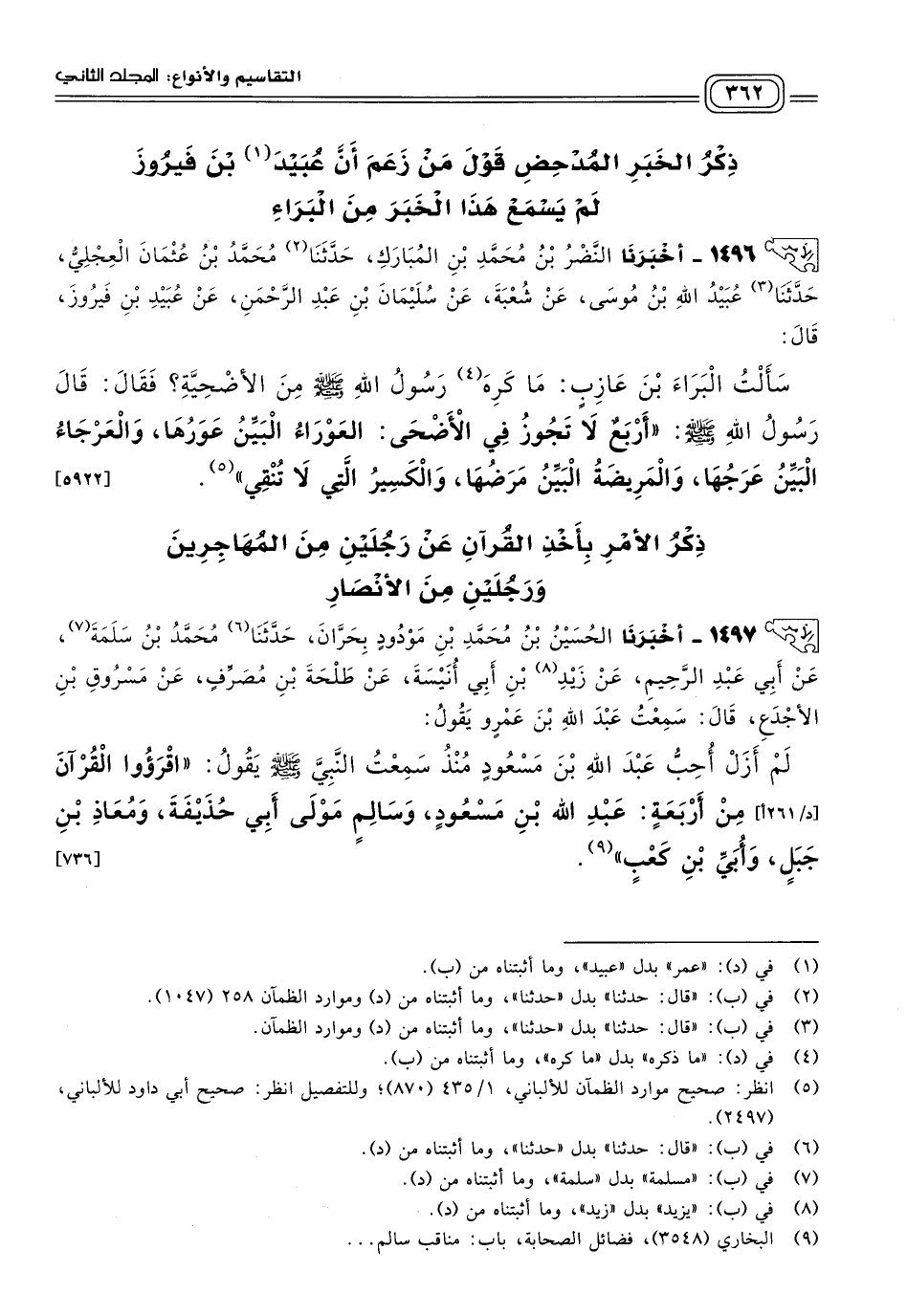 ١٤٩٧ - أَخبَرنا الْحُسَيْنُ بْنُ مُحَمَّدِ بْنِ مَوْدُودٍ بِحَرَّانَ، حَدثنا مُحَمَّدُ بْنُ سَلَمَةَ، عَنْ أَبِي عَبْدِ الرَّحِيمِ، عَنْ زَيْدِ بْنِ أَبِي أُنَيْسَةَ، عَنْ طَلْحَةَ بْنِ مُصَرِّفٍ، عَنْ مَسْرُوقِ بْنِ الأَجْدَعِ، قَالَ: سَمِعْتُ عَبْدَ اللهِ بْنَ عَمْرٍو، يَقُولُ: لَمْ أَزَلْ أُحِبُّ عَبْدَ اللهِ بْنَ مَسْعُودٍ مُنْذُ سَمِعْتُ النَّبِيَّ صَلى الله عَلَيه وسَلم، يَقُولُ: "اقْرَؤُوا الْقُرْآنَ مِنْ أَرْبَعَةٍ: عَبْدِ اللهِ بْنِ مَسْعُودٍ، وَسَالِمٍ مَوْلَى أَبِي حُذَيْفَةَ، وَمُعَاذِ بْنِ جَبَلٍ، وَأُبَيِّ بْنِ كَعْبٍ". [٧٣٦]