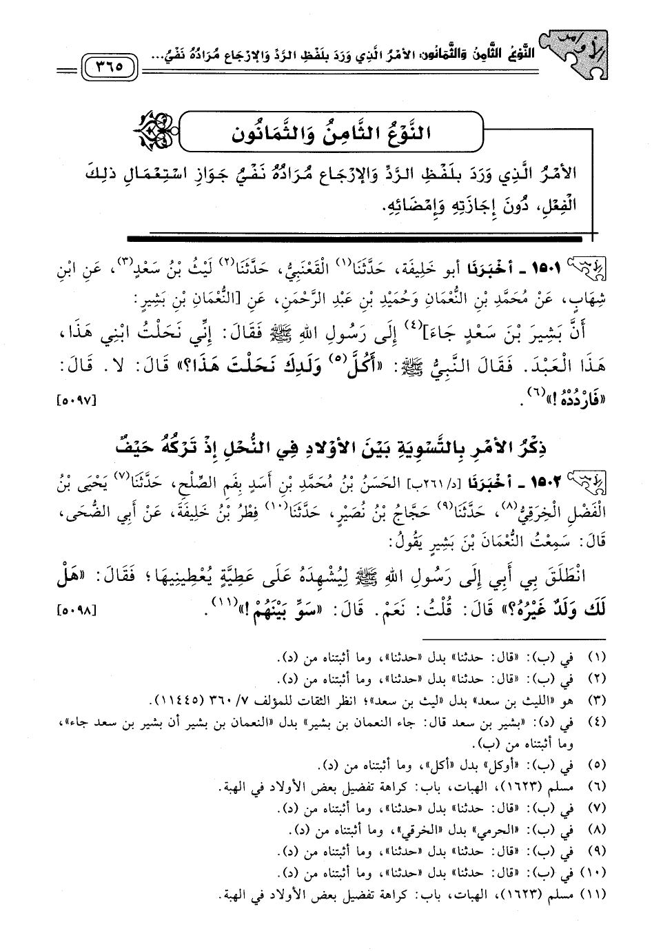 ١٥٠١ - أَخبَرنا أَبُو خَلِيفَةَ، حَدثنا الْقَعْنَبِيُّ، حَدثنا لَيْثُ بْنُ سَعْدٍ، عَنِ ابْنِ شِهَابٍ، عَنْ مُحَمَّدِ بْنِ النُّعْمَانِ، وَحُمَيْدِ بْنِ عَبْدِ الرَّحْمَنِ، عَنِ النُّعْمَانِ بْنِ بَشِيرٍ، أَنَّ بَشِيرَ بْنَ سَعْدٍ جَاءَ إِلَى رَسُولِ اللهِ صَلى الله عَلَيه وسَلم، فَقَالَ: إِنِّي نَحَلْتُ ابْنِي هَذَا، هَذَا الْعَبْدَ، فَقَالَ النَّبِيُّ صَلى الله عَلَيه وسَلم: "أَكُلَّ وَلَدِكَ نَحَلْتَ هَذَا؟ " قَالَ: لَا، قَالَ: "فَارْدُدْهُ". [٥٠٩٧]