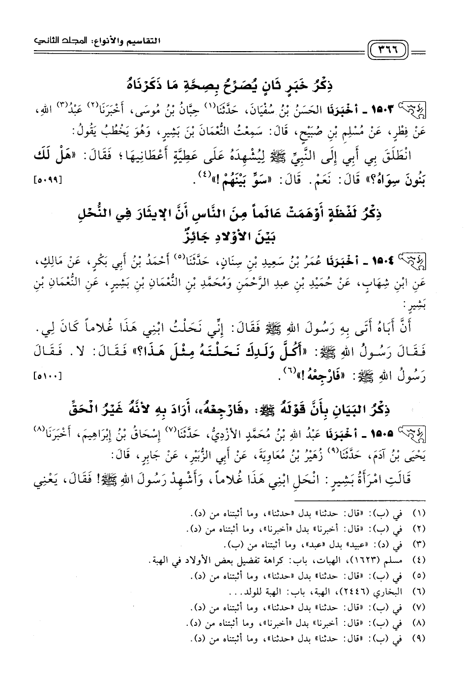 ١٥٠٤ - أَخبَرنا عُمَرُ بْنُ سَعِيدِ بْنِ سِنَانٍ، حَدثنا أَحْمَدُ بْنُ أَبِي بَكْرٍ، عَنْ مَالِكٍ، عَنِ ابْنِ شِهَابٍ، عَنْ حُمَيْدِ بْنِ عَبْدِ الرَّحْمَنِ، وَمُحَمَّدِ بْنِ النُّعْمَانِ بْنِ بَشِيرٍ، عَنِ النُّعْمَانِ بْنِ بَشِيرٍ، أَنَّ أَبَاهُ أَتَى بِهِ رَسُولَ اللهِ صَلى الله عَلَيه وسَلم، فَقَالَ: إِنِّي نَحَلْتُ ابْنِي هَذَا غُلَامًا كَانَ لِي، فَقَالَ رَسُولُ اللهِ صَلى الله عَلَيه وسَلم: "أَكُلَّ وَلَدِكَ نَحَلْتَهُ مِثْلَ هَذَا؟ " فَقَالَ: لَا، فَقَالَ رَسُولُ اللهِ صَلى الله عَلَيه وسَلم: "فَارْجِعْهُ". [٥١٠٠]