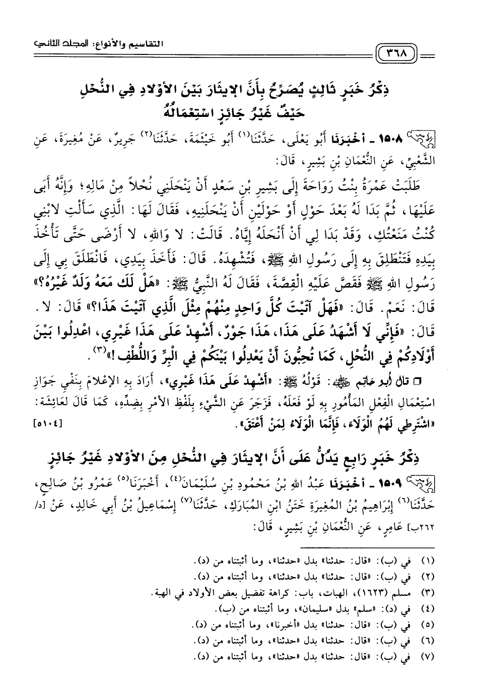١٥٠٨ - أَخبَرنا أَبُو يَعْلَى، حَدثنا أَبُو خَيْثَمَةَ، حَدثنا جَرِيرٌ، عَنْ مُغِيرَةَ، عَنِ الشَّعْبِيِّ، عَنِ النُّعْمَانِ بْنِ بَشِيرٍ، قَالَ: طَلَبَتْ عَمْرَةُ بِنْتُ رَوَاحَةَ إِلَى بَشِيرِ بْنِ سَعْدٍ، أَنْ يَنْحِلَنِيَ نُحْلاً مِنْ مَالِهِ، وَإِنَّهُ أَبَى عَلَيْهَا، ثُمَّ بَدَا لَهُ بَعْدَ حَوْلٍ، أَوْ حَوْلَيْنِ أَنْ يَنْحَلَنِيهِ، فَقَالَ لَهَا: الَّذِي سَأَلْتِ لاِبْنِي كُنْتُ مَنَعْتُكِ، وَقَدْ بَدَا لِي، أَنْ أَنْحَلَهُ إِيَّاهُ، قَالَتْ: لَا وَاللهِ، لَا أَرْضَى حَتَّى تَأْخُذَ بِيَدِهِ، فَتَنْطَلِقَ بِهِ إِلَى رَسُولِ اللهِ صَلى الله عَلَيه وسَلم، فَتُشْهِدَهُ، قَالَ: فَأَخَذَ بِيَدِي، فَانْطَلَقَ بِي إِلَى رَسُولِ اللهِ صَلى الله عَلَيه وسَلم، فَقَصَّ عَلَيْهِ الْقِصَّةَ، فَقَالَ لَهُ النَّبِيُّ صَلى الله عَلَيه وسَلم: "هَلْ لَكَ مَعَهُ وَلَدٌ غَيْرُهُ؟ " قَالَ: نَعَمْ، قَالَ: "فَهَلْ آتَيْتَ كُلَّ وَاحِدٍ مِنْهُمْ مِثْلَ الَّذِي آتَيْتَ هَذَا؟ " قَالَ: لَا، قَالَ: "فَإِنِّي لَا أَشْهَدُ عَلَى هَذَا، هَذَا جَوْرٌ، أَشْهِدْ عَلَى هَذَا غَيْرِي، اعْدِلُوا بَيْنَ أَوْلَادِكُمْ فِي النُّحْلِ كَمَا تُحِبُّونَ أَنْ يَعْدِلُوا بَيْنَكُمْ فِي الْبِرِّ وَاللُّطْفِ".