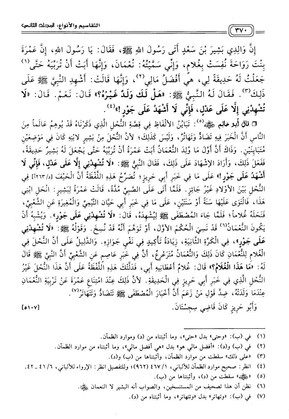 قَالَ أَبُو حَاتِمٍ رَضِيَ اللهُ عَنْهُ: تَبَايُنُ الأَلْفَاظِ فِي قِصَّةِ النُّحْلِ الَّذِي ذَكَرْنَاهُ قَدْ يُوهِمُ عَالَمًا مِنَ النَّاسِ أَنَّ الْخَبَرَ فِيهِ تَضَادٌّ وَتَهَاتُرٌ، وَلَيْسَ كَذَلِكَ، لأَنَّ النُّحْلَ مِنْ بَشِيرٍ لاِبْنِهِ كَانَ فِي مَوْضِعَيْنِ مُتَبَايِنَيْنِ، وَذَاكَ أَنَّ أَوَّلَ مَا وُلِدُ النُّعْمَانُ أَبَتْ عَمْرَةُ أَنْ تُرَبِّيَهُ حَتَّى يَجْعَلَ لَهُ بَشِيرٌ حَدِيقَةً، فَفَعَلَ ذَلِكَ، وَأَرَادَ الإِشْهَادَ عَلَى ذَلِكَ، فَقَالَ النَّبِيُّ صَلى الله عَلَيه وسَلم: "لَا تُشْهِدْنِي إِلَاّ عَلَى عَدْلٍ، فَإِنِّي لَا أَشْهَدُ عَلَى جَوْرٍ"، عَلَى مَا فِي خَبَرِ أَبِي حَرِيزٍ، تُصَرِّحُ هَذِهِ اللَّفْظَةُ، أَنَّ الْحَيْفَ فِي النُّحْلِ بَيْنَ الأَوْلَادِ غَيْرُ جَائِزٍ، فَلَمَّا أَتَى عَلَى الصَّبِيِّ مُدَّةٌ، قَالَتْ عَمْرَةُ لِبَشِيرٍ: انْحَلِ ابْنِي هَذَا، فَالْتَوَى عَلَيْهَا سَنَةً، أَوْ سَنَتَيْنِ عَلَى مَا فِي خَبَرِ أَبِي حَيَّانَ التَّيْمِيِّ، وَالْمُغِيرَةِ، عَنِ الشَّعْبِيِّ، فَنَحَلَهُ غُلَامًا، فَلَمَّا جَاءَ الْمُصْطَفَى صَلى الله عَلَيه وسَلم، لِيُشْهِدَهُ، قَالَ: "لَا تُشْهِدْنِي عَلَى جَوْرٍ"، وَيُشْبِهُ أَنْ يَكُونَ النُّعْمَانُ، قَدْ نَسِيَ الْحُكْمَ الأَوَّلَ، أَوْ تَوَهَّمَ أَنَّهُ قَدْ نُسِخَ، وَقَوْلُهُ صَلى الله عَلَيه وسَلم: "لَا تُشْهِدْنِي عَلَى جَوْرٍ"، فِي الْكَرَّةِ الثَّانِيَةِ زِيَادَةُ تَأْكِيدٍ فِي نَفْيِ جَوَازِهِ، وَالدَّلِيلُ عَلَى أَنَّ النُّحْلَ فِي الْغُلَامِ لِلنُّعْمَانِ كَانَ ذَلِكَ، وَالنُّعْمَانُ مُتَرَعْرِعٌ أَنَّ فِيَ خَبَرِ عَاصِمٍ عَنِ الشَّعْبِيِّ، أَنَّ النَّبِيَّ صَلى الله عَلَيه وسَلم قَالَ لَهُ: "مَا هَذَا الْغُلَامُ؟ " قَالَ: غُلَامٌ أَعْطَانِيهِ أَبِي، فَدَلَّتْكَ هَذِهِ اللَّفْظَةُ عَلَى أَنَّ هَذَا النُّحْلَ غَيْرُ النُّحْلِ الَّذِي فِي خَبَرِ، أَبِي حَرِيزٍ فِي الْحَدِيقَةِ، لأَنَّ ذَلِكَ عِنْدَ امْتِنَاعِ عَمْرَةَ عَنْ تَرْبِيَةِ النُّعْمَانِ عِنْدَمَا وَلَدَتْهُ، ضِدَّ قَوْلِ مَنْ زَعَمَ أَنَّ أَخْبَارَ الْمُصْطَفَى صَلى الله عَلَيه وسَلم، تَتَضَادُّ، وَتَتَهَاتَرُ.