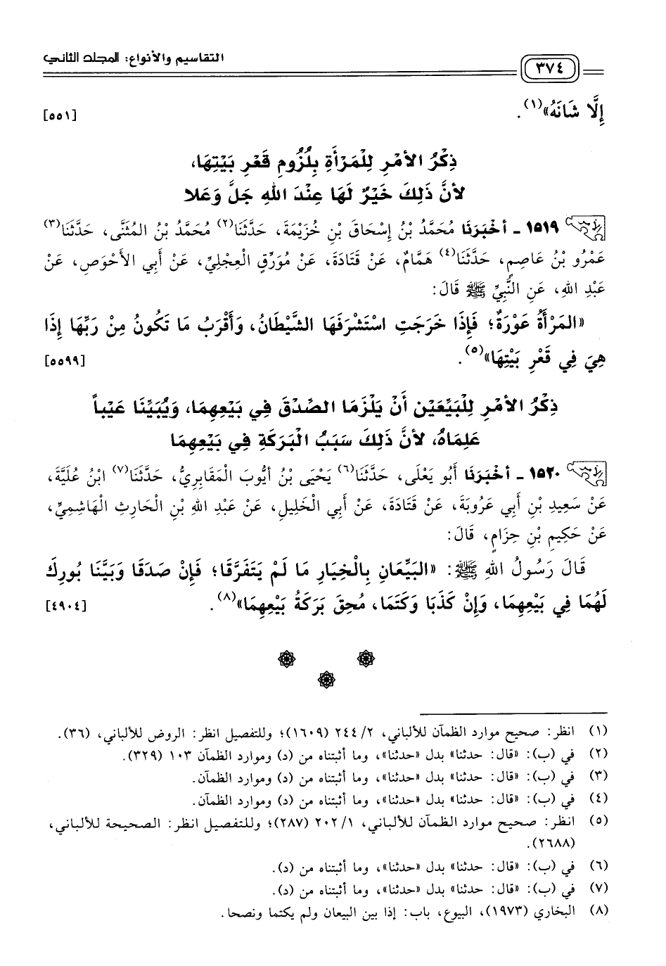 ١٥١٩ - أَخبَرنا مُحَمَّدُ بْنُ إِسْحَاقَ بْنِ خُزَيْمَةَ، حَدثنا مُحَمَّدُ بْنُ الْمُثَنَّى، حَدثنا عَمْرُو بْنُ عَاصِمٍ، حَدثنا هَمَّامٌ، عَنْ قَتَادَةَ، عَنْ مُوَرِّقٍ الْعِجْلِيِّ، عَنْ أَبِي الأَحْوَصِ، عَنْ عَبْدِ اللهِ، عَنِ النَّبِيِّ صَلى الله عَلَيه وسَلم قَالَ: "الْمَرْأَةُ عَوْرَةٌ، فَإِذَا خَرَجَتِ اسْتَشْرَفَهَا الشَّيْطَانُ، وَأَقْرَبُ مَا تَكُونُ مِنْ رَبِّهَا إِذَا هِيَ فِي قَعْرِ بَيْتِهَا". [٥٥٩٩]