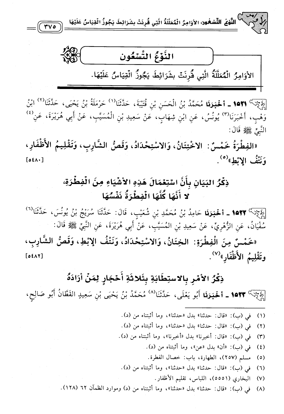 ١٥٢٢ - أَخبَرنا حَامِدُ بْنُ مُحَمَّدِ بْنِ شُعَيْبٍ، قَالَ: حَدثنا سُرَيْجُ بْنُ يُونُسَ، حَدثنا سُفْيَانُ، عَنِ الزُّهْرِيِّ، عَنْ سَعِيدِ بْنِ الْمُسَيَّبِ، عَنْ أَبِي هُرَيْرَةَ، عَنِ النَّبِيِّ صَلى الله عَلَيه وسَلم قَالَ: "خَمْسٌ مِنَ الْفِطْرَةِ: الْخِتَانُ، وَالاِسْتِحْدَادُ، وَنَتْفُ الإِبِطِ، وَقَصُّ الشَّارِبِ، وَتَقْلِيمُ الأَظْفَارِ". [٥٤٨٢]