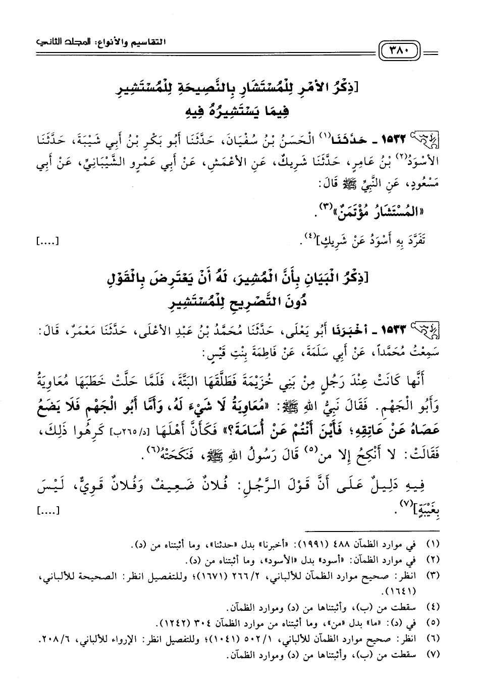 ١٥٣٢ - حدثنا الحسن بن سفيان، حدثنا أبو بكر بن أبي شيبة، حدثنا الأسود بن عامر، حدثنا شريك، عن الأعمش، عن أبي عمرو الشيباني، عن أبي مسعود، عن النبي صلى الله عليه وسلم قال: "المستشار مؤتمن".