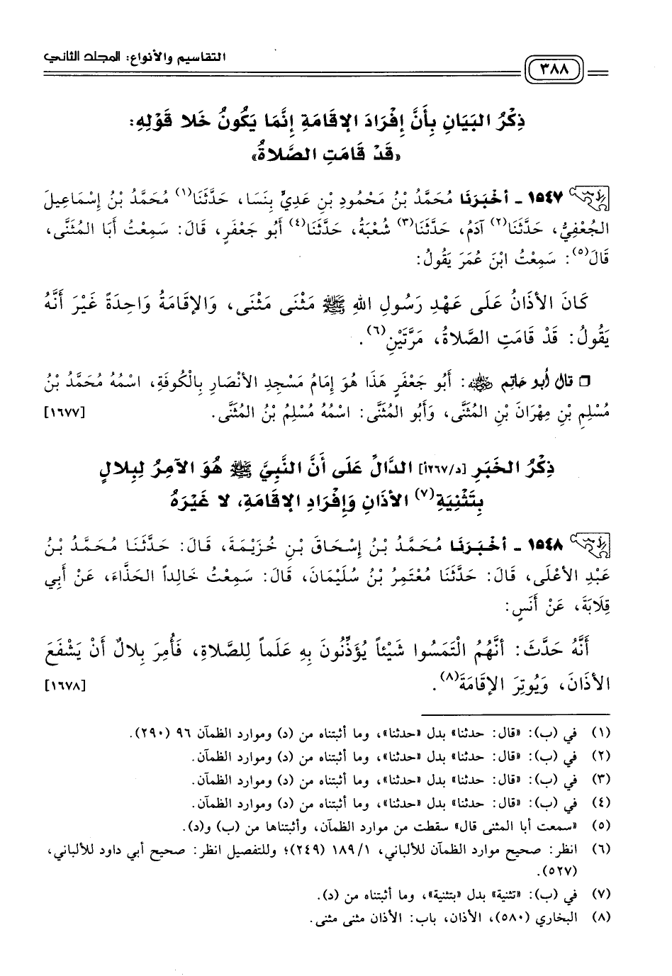 ١٥٤٨ - أَخبَرنا مُحَمَّدُ بْنُ إِسْحَاقَ بْنِ خُزَيْمَةَ، قَالَ: حَدثنا مُحَمَّدُ بْنُ عَبْدِ الأَعْلَى، قَالَ: حَدثنا مُعْتَمِرُ بْنُ سُلَيْمَانَ، قَالَ: سَمِعْتُ خَالِدًا الْحَذَّاءَ، عَنْ أَبِي قِلَابَةَ، عَنْ أَنَسٍ أَنَّهُ حَدَّثَ: أَنَّهُمُ الْتَمَسُوا شَيْئًا يُؤَذِّنُونَ بِهِ عَلَمًا لِلصَّلَاةِ فَأُمِرَ بِلَالٌ أَنْ يَشْفَعَ الأَذَانَ وَيُوتِرَ الإِقَامَةَ. [١٦٧٨]