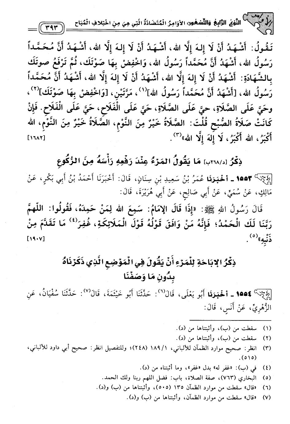 ١٥٥٣ - أَخبَرنا عُمَرُ بْنُ سَعِيدِ بْنِ سِنَانٍ، قَالَ: أَخبَرنا أَحْمَدُ بْنُ أَبِي بَكْرٍ، عَنْ مَالِكٍ، عَنْ سُمَيٍّ، عَنْ أَبِي صَالِحٍ، عَنْ أَبِي هُرَيْرَةَ، قَالَ: قَالَ رَسُولُ اللهِ صَلى الله عَلَيه وسَلم: "إِذَا قَالَ الإِمَامُ: سَمِعَ اللهُ لِمَنْ حَمِدَهُ، فَقُولُوا: اللهُمَّ رَبَّنَا لَكَ الْحَمْدُ، فَإِنَّهُ مَنْ وَافَقَ قَوْلُهُ قَوْلَ الْمَلَائِكَةِ، غُفِرَ مَا تَقَدَّمَ مِنْ ذَنْبِهِ". [١٩٠٧]