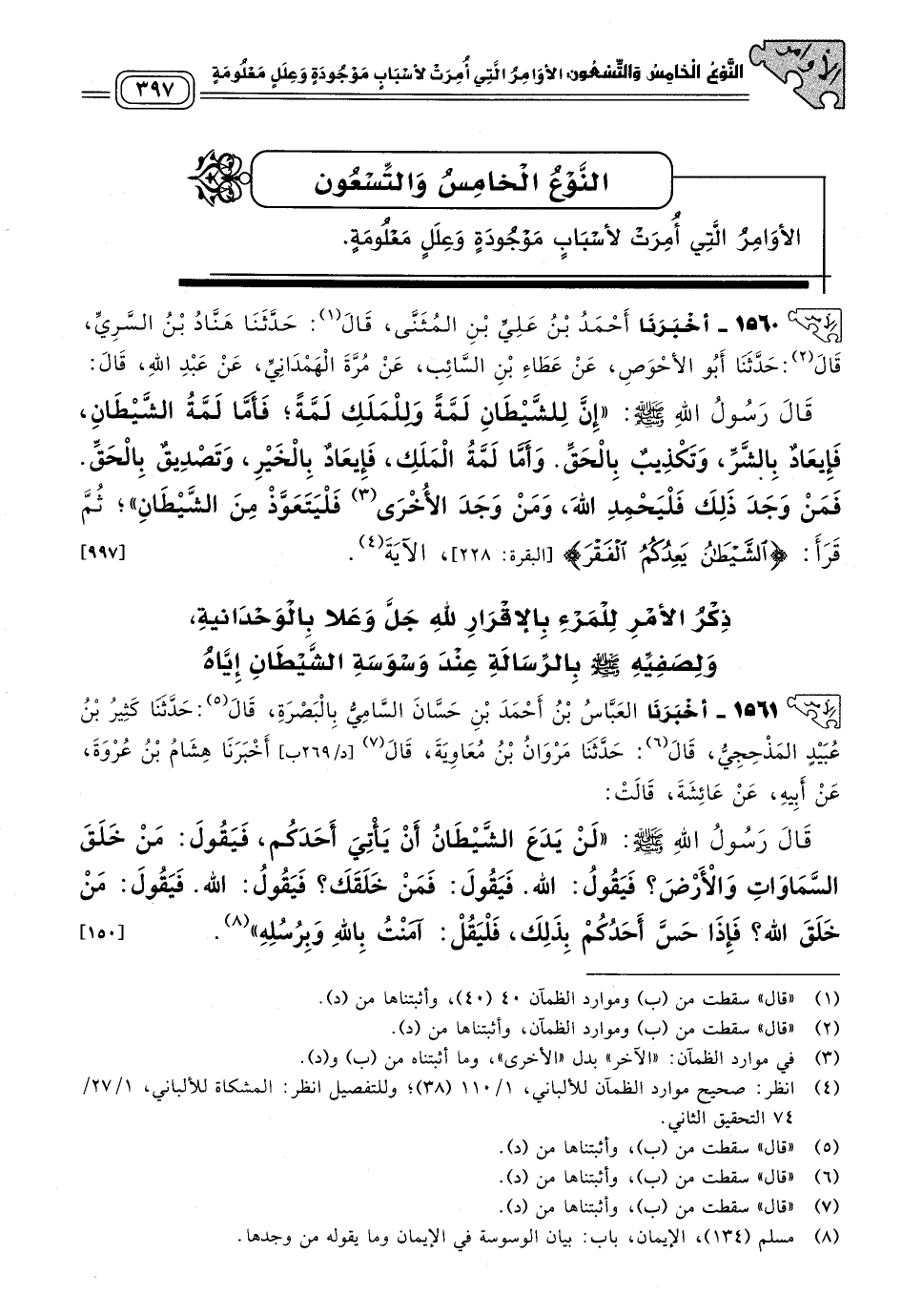 ١٥٦٠ - أَخبَرنا أَحْمَدُ بْنُ عَلِيِّ بْنِ الْمُثَنَّى، قال: حَدثنا هَنَّادُ بْنُ السَّرِيِّ، قال: حَدثنا أَبُو الأَحْوَصِ، عَنْ عَطَاءِ بْنِ السَّائِبِ، عَنْ مُرَّةَ الْهَمْدَانِيِّ، عَنْ عَبْدِ اللهِ، قَالَ: قَالَ رَسُولُ اللهِ صَلى الله عَلَيه وسَلم: "إِنَّ لِلشَّيْطَانِ لَمَّةً، وَلِلْمَلَكِ لَمَّةً، فَأَمَّا لَمَّةُ الشَّيْطَانِ فَإِيعَادٌ بِالشَّرِّ وَتَكْذِيبٌ بِالْحَقِّ، وَأَمَّا لَمَّةُ الْمَلَكِ فَإِيعَادٌ بِالْخَيْرِ وَتَصْدِيقٌ بِالْحَقِّ، فَمَنْ وَجَدَ ذَلِكَ فَلْيَحْمَدِ اللهَ، وَمَنْ وَجَدَ الأُخْرَى، فَلْيَتَعَوَّذْ مِنَ الشَّيْطَانِ"، ثُمَّ قَرَأَ: {الشَّيْطَانُ يَعِدُكُمُ الْفَقْرَ} [البقرة: ٢٢٨] الآيَةَ. [٩٩٧]