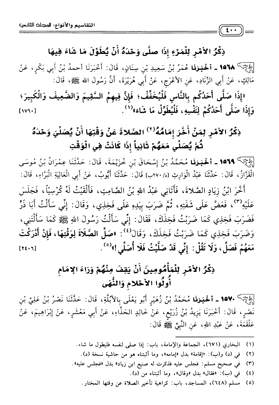 ١٥٦٨ - أَخبَرنا عُمَرُ بْنُ سَعِيدِ بْنِ سِنَانٍ، قَالَ: أَخبَرنا أَحْمَدُ بْنُ أَبِي بَكْرٍ، عَنْ مَالِكٍ، عَنْ أَبِي الزِّنَادِ، عَنِ الأَعْرَجِ، عَنْ أَبِي هُرَيْرَةَ، أَنَّ رَسُولَ اللهِ صَلى الله عَلَيه وسَلم قَالَ: "إِذَا صَلَّى أَحَدُكُمْ بِالنَّاسِ فَلْيُخَفِّفْ، فَإِنَّ فِيهِمُ السَّقِيمَ، وَالضَّعِيفَ، وَالْكَبِيرَ، وَإِذَا صَلَّى أَحَدُكُمْ لِنَفْسِهِ فَلْيُطَوِّلْ مَا شَاءَ". [١٧٦٠]