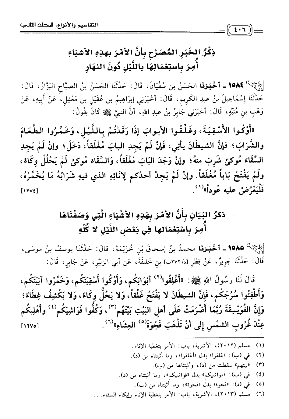 ١٥٨٤ - أَخبَرنا الْحَسَنُ بْنُ سُفْيَانَ، قَالَ: حَدثنا الْحَسَنُ بْنُ الصَّبَّاحِ الْبَزَّارُ، قَالَ: حَدثنا إِسْمَاعِيلُ بْنُ عَبْدِ الْكَرِيمِ، قَالَ: أَخْبَرَنِي إِبْرَاهِيمُ بْنُ عَقِيلِ بْنِ مَعْقِلٍ، عَنْ أَبِيهِ، عَنْ وَهْبِ بْنِ مُنَبِّهٍ، قَالَ: أَخْبَرَنِي جَابِرُ بْنُ عَبْدِ اللهِ، أَنَّ النَّبِيَّ صَلى الله عَلَيه وسَلم كَانَ يَقُولُ: "أَوْكُوا الأَسْقِيَةَ، وَغَلِّقُوا الأَبْوَابَ إِذَا رَقَدْتُمْ بِاللَّيْلِ، وَخَمِّرُوا الطَّعَامَ وَالشَّرَابَ، فَإِنَّ الشَّيْطَانَ يَأْتِي، فَإِنْ لَمْ يَجِدِ الْبَابَ مُغْلَقًا دَخَلَ، وَإِنْ لَمْ يَجِدِ السِّقَاءَ مُوكًى شَرِبَ مِنْهُ، وَإِنْ وَجَدَ الْبَابَ مُغْلَقًا وَالسِّقَاءَ مُوكًى لَمْ يَحْلُلْ وِكَاءً وَلَمْ يَفْتَحْ بَابًا مُغْلَقًا، وَإِنْ لَمْ يَجِدْ أَحَدُكُمْ لإِنَائِهِ الَّذِي فِيهِ شَرَابُهُ مَا يُخَمِّرُهُ، فَلْيَعْرِضْ عَلَيْهِ عُودًا". [١٢٧٤]