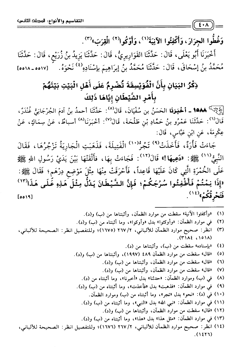 ١٥٨٨ - أَخبَرنا الْحَسَنُ بْنُ سُفْيَانَ، قَالَ: حَدثنا أَحْمَدُ بْنُ آدَمَ الْجُرْجَانِيُّ غُنْدَرٌ، قَالَ: حَدثنا عَمْرُو بْنُ حَمَّادِ بْنِ طَلْحَةَ، قَالَ: أخبرنا أَسْبَاطٌ، عَنْ سِمَاكٍ، عَنْ عِكْرِمَةَ، عَنِ ابْنِ عَبَّاسٍ، قَالَ: جَاءَتْ فَأَرَةٌ، فَأَخَذَتْ تَجُرُّ الْفَتِيلَةَ، فَذَهَبَتِ الْجَارِيَةُ تَزْجُرُهَا، فَقَالَ النَّبِيُّ صَلى الله عَلَيه وسَلم: "دَعِيهَا"، قَالَ: فَجَاءَتْ بِهَا فَأَلْقَتْهَا بَيْنَ يَدَيْ رَسُولِ اللهِ صَلى الله عَلَيه وسَلم عَلَى الْخُمْرَةِ الَّتِي كَانَ عَلَيْهَا قَاعِدًا، فَأَحْرَقَتْ مِنْهَا مِثْلَ مَوْضِعِ دِرْهَمٍ، فَقَالَ صَلى الله عَلَيه وسَلم: "إِذَا نِمْتُمْ فَأَطْفِئُوا سُرُجَكُمْ، فَإِنَّ الشَّيْطَانَ يَدُلُّ مِثْلَ هَذِهِ عَلَى هَذَا فَتُحْرِقَكُمْ". [٥٥١٩]
