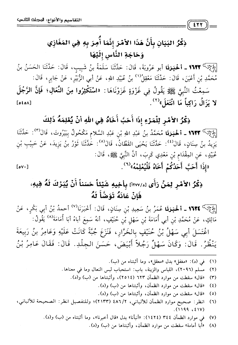 ١٦٢٢ - أَخبَرنا أَبُو عَرُوبَةَ، قَالَ: حَدثنا سَلَمَةُ بْنُ شَبِيبٍ، قَالَ: حَدثنا الْحَسَنُ بْنُ مُحَمَّدِ بْنِ أَعْيَنَ، قَالَ: حَدثنا مَعْقِلُ بْنُ عُبَيْدِ اللهِ، عَنْ أَبِي الزُّبَيْرِ، عَنْ جَابِرٍ، قَالَ: سَمِعْتُ النَّبِيَّ صَلى الله عَلَيه وسَلم يَقُولُ فِي غَزْوَةٍ غَزَوْنَاهَا: "اسْتَكْثِرُوا مِنَ النِّعَالِ فَإِنَّ الرَّجُلَ لَا يَزَالُ رَاكِبًا مَا انْتَعَلَ". [٥٤٥٨]