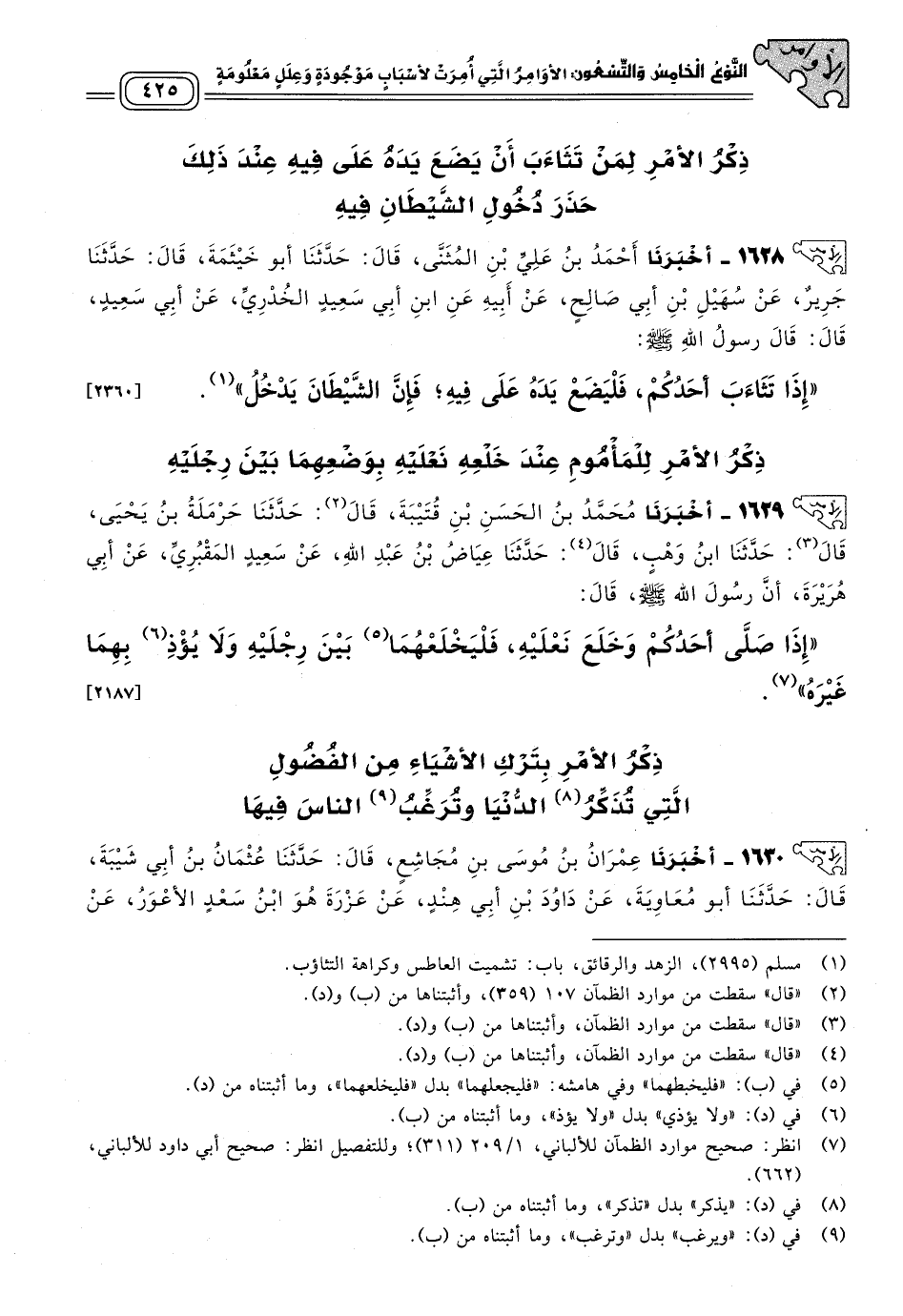 ١٦٢٨ - أَخبَرنا أَحْمَدُ بْنُ عَلِيِّ بْنِ الْمُثَنَّى، قَالَ: حَدثنا أَبُو خَيْثَمَةَ، قَالَ: حَدثنا جَرِيرٌ، عَنْ سُهَيْلِ بْنِ أَبِي صَالِحٍ، عَنْ أَبِيهِ، عَنِ ابْنِ أَبِي سَعِيدٍ الْخُدْرِيِّ، عَنْ أَبِي سَعِيدٍ، قَالَ: قَالَ رَسُولُ اللهِ صَلى الله عَلَيه وسَلم: "إِذَا تَثَاءَبَ أَحَدُكُمْ فَلْيَضَعْ يَدَهُ عَلَى فِيهِ، فَإِنَّ الشَّيْطَانَ يَدْخُلُ". [٢٣٦٠]