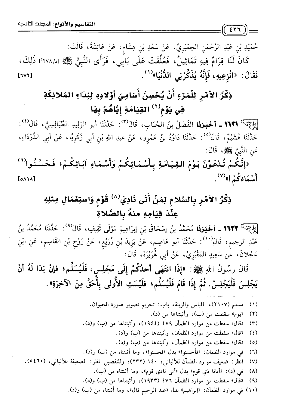 ١٦٣١ - أَخبَرنا الْفَضْلُ بْنُ الْحُبَابِ، قَالَ: حَدثنا أَبُو الْوَلِيدِ الطَّيَالِسِيُّ، قَالَ: حَدثنا هُشَيْمٌ، قَالَ: حَدثنا دَاوُدُ بْنُ عَمْرٍو، عَنْ عَبْدِ اللهِ بْنِ أَبِي زَكَرِيَّا، عَنْ أَبِي الدَّرْدَاءِ، عَنِ النَّبِيِّ صَلى الله عَلَيه وسَلم قَالَ: "إِنَّكُمْ تُدْعَوْنَ يَوْمَ الْقِيَامَةِ بِأَسْمَائِكُمْ وَأَسْمَاءِ آبَائِكُمْ، فَحَسِّنُوا أَسْمَاءَكُمْ". [٥٨١٨]