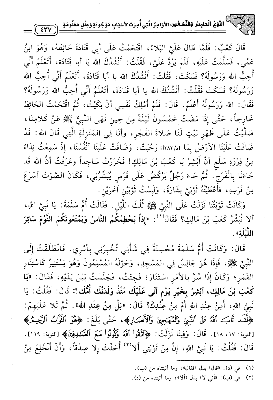 فَقُلْتُ: أَنْشُدُكَ اللهَ يَا أَبَا قَتَادَةَ أَتَعْلَمُ أَنِّي أُحَبُّ اللهَ وَرَسُولَهُ؟ فَقَالَ: اللهُ وَرَسُولُهُ أَعْلَمُ، قَالَ: فَلَمْ أَمْلِكْ نَفْسِي أَنْ بَكَيْتُ، ثُمَّ اقْتَحَمْتُ الْحَائِطَ خَارِجًا، حَتَّى إِذَا مَضَتْ خَمْسُونَ لَيْلَةً مِنْ حِينِ نَهَى النَّبِيُّ صَلى الله عَلَيه وسَلم عَنْ كَلَامِنَا، صَلَّيْتُ عَلَى ظَهْرِ بَيْتٍ لَنَا صَلَاةَ الْفَجْرِ، وَأَنَا فِي الْمَنْزِلَةِ الَّتِي قَالَ اللهُ، قَدْ ضَاقَتْ عَلَيْنَا الأَرْضُ بِمَا رَحُبَتْ وَضَاقَتْ عَلَيْنَا أَنْفُسُنَا، إِذْ سَمِعْتُ نِدَاءً مِنْ ذِرْوَةِ سَلْعٍ أَنْ أَبْشِرْ يَا كَعْبَ بْنَ مَالِكٍ، فَخَرَرْتُ سَاجِدًا، وَعَرَفْتُ أَنَّ اللهَ قَدْ جَاءَنَا بِالْفَرَجِ، ثُمَّ جَاءَ رَجُلٌ يَرْكُضُ عَلَى فَرَسٍ يُبَشِّرُنِي، فَكَانَ الصَّوْتُ أَسْرَعَ مِنْ فَرَسِهِ، فَأَعْطَيْتُهُ ثَوْبَيَّ بِشَارَةً، وَلَبِسَتْ ثَوْبَيْنِ آخَرِينَ.