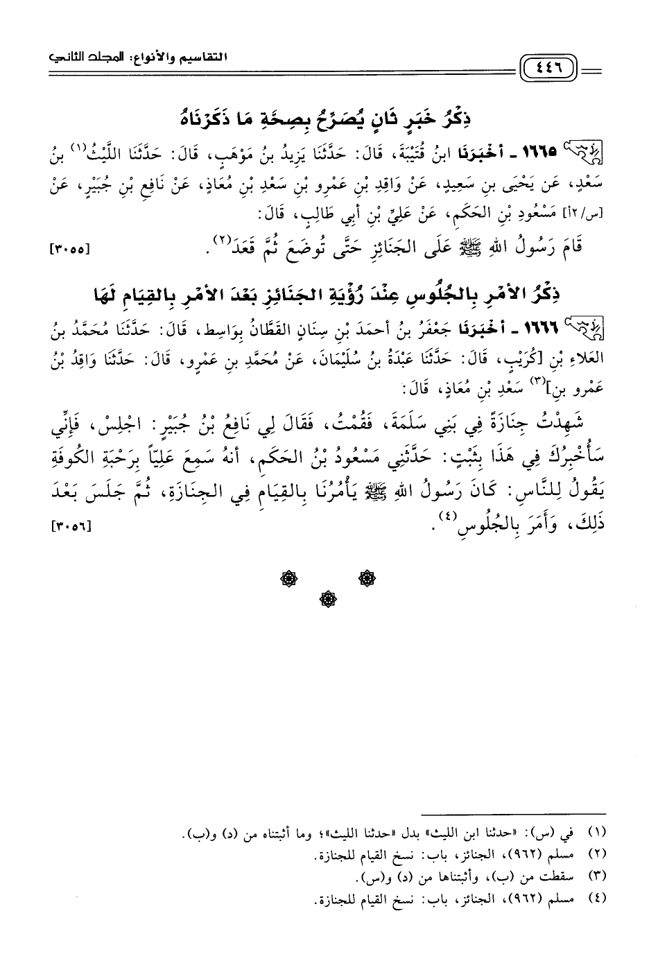 ١٦٦٦ - أَخبَرنا جَعْفَرُ بْنُ أَحْمَدَ بْنِ سِنَانٍ الْقَطَّانُ، بِوَاسِطَ، قَالَ: حَدثنا مُحَمَّدُ بْنُ الْعَلَاءِ بْنِ كُرَيْبٍ، قَالَ: حَدثنا عَبْدَةُ بْنُ سُلَيْمَانَ، عَنْ مُحَمَّدِ بْنِ عَمْرٍو، قَالَ: حَدثنا وَاقِدُ بْنُ عَمْرِو بْنِ سَعْدِ بْنِ مُعَاذٍ، قَالَ: شَهِدْتُ جَنَازَةً فِي بَنِي سَلِمَةَ، فَقُمْتُ، فَقَالَ لِي نَافِعُ بْنُ جُبَيْرٍ، اجْلِسْ، فَإِنِّي سَأُخْبِرُكَ فِي هَذَا بِثَبْتٍ، حَدَّثَنِي مَسْعُودُ بْنُ الْحَكَمِ، أَنَّهُ سَمِعَ عَلِيًّا، بِرَحْبَةِ الْكُوفَةِ يَقُولُ لِلنَّاسِ: كَانَ رَسُولُ اللهِ صَلى الله عَلَيه وسَلم يَأْمُرُنَا بِالْقِيَامِ فِي الْجَنَازَةِ، ثُمَّ جَلَسَ بَعْدَ ذَلِكَ، وَأَمَرَ بِالْجُلُوسِ. [٣٠٥٦]