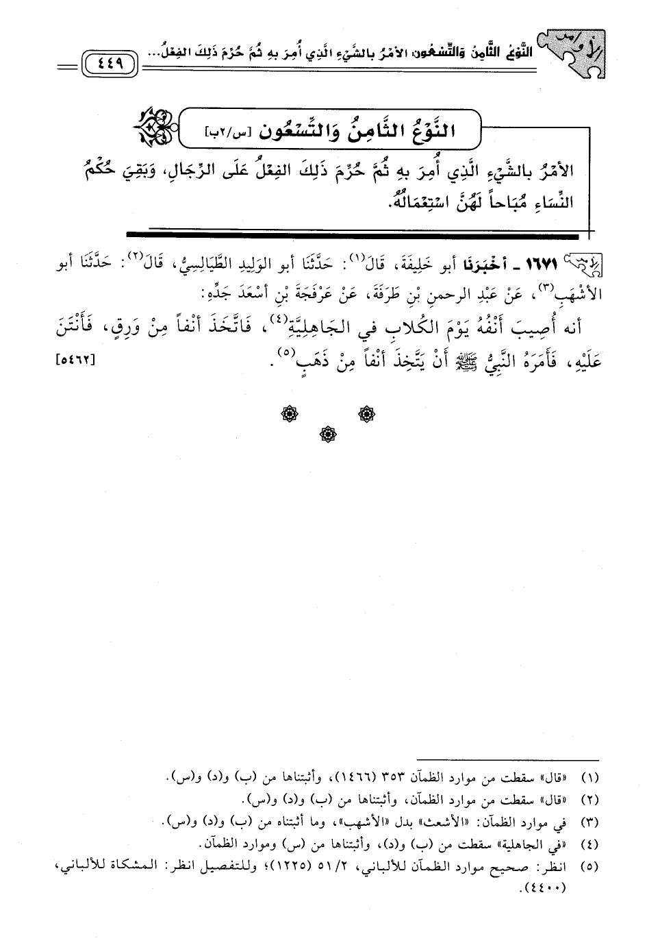 ١٦٧١ - أَخبَرنا أَبُو خَلِيفَةَ، قَالَ: حَدثنا أَبُو الْوَلِيدِ الطَّيَالِسِيُّ، قَالَ: حَدثنا أَبُو الأَشْهَبِ، عَنْ عَبْدِ الرَّحْمَنِ بْنِ طَرَفَةَ، عَنْ عَرْفَجَةَ بْنِ أَسْعَدَ جَدِّهِ، أَنَّهُ أُصِيبَ أَنْفُهُ يَوْمَ الْكُلَابِ في الجاهلية، فَاتَّخَذَ أَنْفًا مِنْ وَرِقٍ فَأَنْتَنَ عَلَيْهِ، فَأَمَرَهُ النَّبِيُّ صَلى الله عَلَيه وسَلم أَنْ يَتَّخِذَ أَنْفًا مِنْ ذَهَبٍ. [٥٤٦٢]
