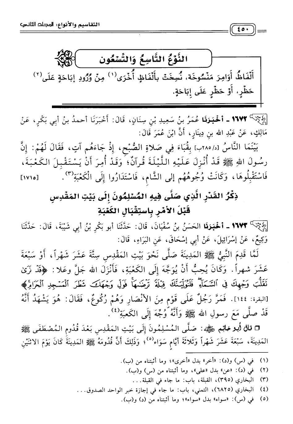 قَالَ أَبُو حَاتِمٍ رَضِيَ اللهُ عَنْهُ: صَلَّى الْمُسْلِمُونَ إِلَى بَيْتِ الْمَقْدِسِ بَعْدَ قَدُومِ الْمُصْطَفَى صَلى الله عَلَيه وسَلم الْمَدِينَةَ سَبْعَةَ عَشْرًا شَهْرًا وَثَلَاثَةَ أَيَّامٍ سَوَاءً، وَذَلِكَ أَنَّ قُدُومَهُ صَلى الله عَلَيه وسَلم الْمَدِينَةَ كَانَ يَوْمَ الاِثْنَيْنِ، لاِثْنَتَيْ عَشْرَةَ لَيْلَةً خَلَتْ مِنْ رَبِيعٍ الأَوَّلِ، وَأَمَرَهُ اللهُ جَلَّ وَعَلَا بِاسْتِقْبَالِ الْكَعْبَةِ يَوْمَ الثُّلَاثَاءِ، لِلْنِصْفِ مِنْ شَعْبَانَ، فَذَلِكَ مَا وَصَفْتُ عَلَى صِحَّةِ مَا ذَكَرْتُ. [١٧١٦]