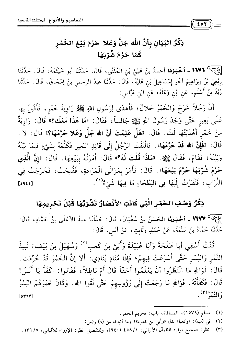 ١٦٧٧ - أَخبَرنا الْحَسَنُ بْنُ سُفْيَانَ، قَالَ: حَدثنا عَبْدُ الأَعْلَى بْنُ حَمَّادٍ، قَالَ: حَدثنا حَمَّادُ بْنُ سَلَمَةَ، عَنْ حُمَيْدٍ، وَثَابِتٍ، عَنْ أَنَسٍ، قَالَ: كُنْتُ أَسْقِي أَبَا طَلْحَةَ وَأَبَا عُبَيْدَةَ وأبي بن كعب وَسُهَيْلَ بْنَ بَيْضَاءَ نَبِيذَ التَّمْرِ وَالْبُسْرِ حَتَّى أَسْرَعَتْ فِيهِمْ، فَإِذَا مُنَادٍ يُنَادِي: أَلَا إِنَّ الْخَمْرَ قَدْ حُرِّمَتْ، قَالَ: فَوَاللهِ مَا انْتَظَرُوا أَنْ يَعْلَمُوا أَحَقًّا قَالَ أَمْ بَاطِلاً، فَقَالُوا: اكْفَأْ يَا أَنَسُ، قَالَ: فَكَفَأْتُهُ، فَوَاللهِ مَا رَجَعَتْ إِلَى رُؤُوسِهِمْ حَتَّى لَقُوا اللهَ، وَكَانَ خَمْرَهُمُ الْبُسْرُ وَالتَّمْرُ. [٥٣٦٣]