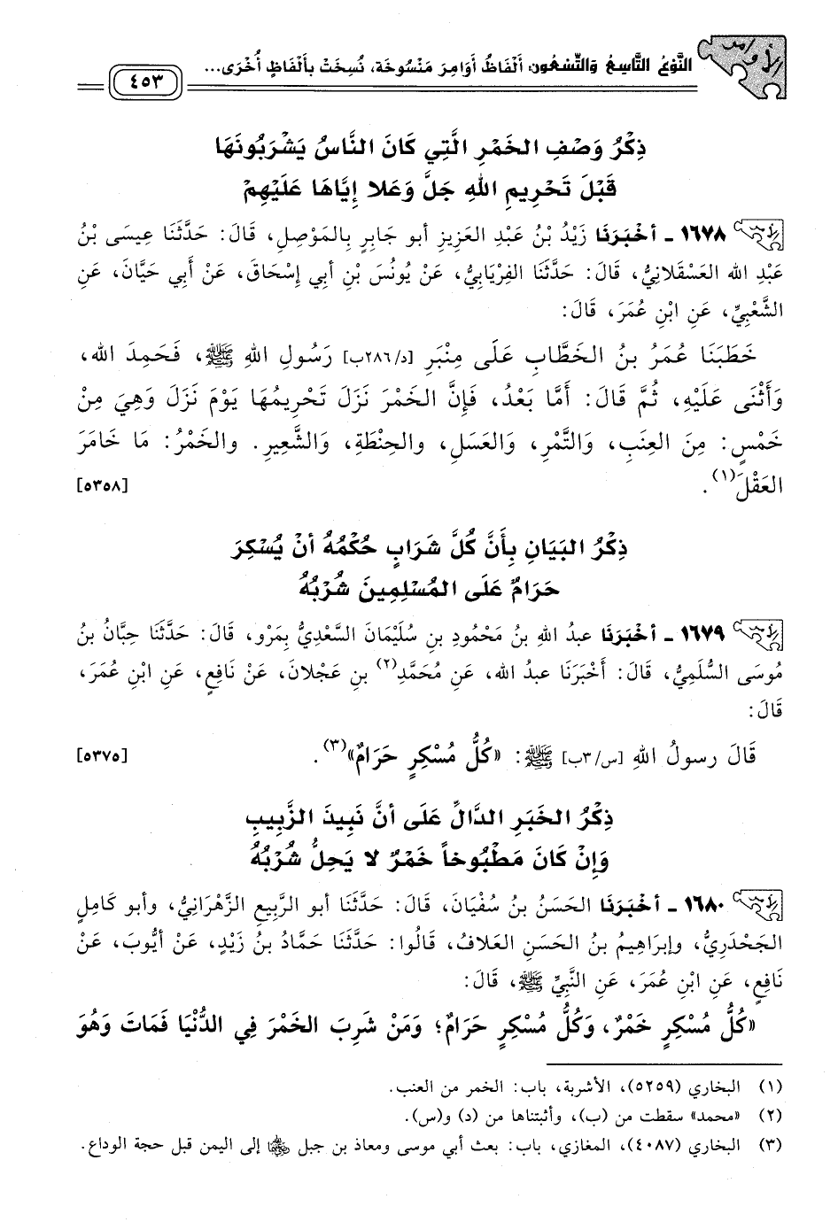 ١٦٨٠ - أَخبَرنا الْحَسَنُ بْنُ سُفْيَانَ، قَالَ: حَدثنا أَبُو الرَّبِيعِ الزَّهْرَانِيُّ، وَأَبُو كَامِلٍ الْجَحْدَرِيُّ، وَإِبْرَاهِيمُ بْنُ الْحَسَنِ الْعَلَاّفُ، قَالُوا: حَدثنا حَمَّادُ بْنُ زَيْدٍ، عَنْ أَيُّوبَ، عَنْ نَافِعٍ، عَنِ ابْنِ عُمَرَ، عَنِ النَّبِيِّ صَلى الله عَلَيه وسَلم قَالَ: "كُلُّ مُسْكِرٍ خَمْرٌ، وَكُلُّ مُسْكِرٍ حَرَامٌ، وَمَنْ شَرِبَ الْخَمْرَ فِي الدُّنْيَا فَمَاتَ وَهُوَ يُدْمِنُهَا لَمْ يَتُبْ مِنْهَا، لَمْ يَشْرَبْهَا فِي الآخِرَةِ".