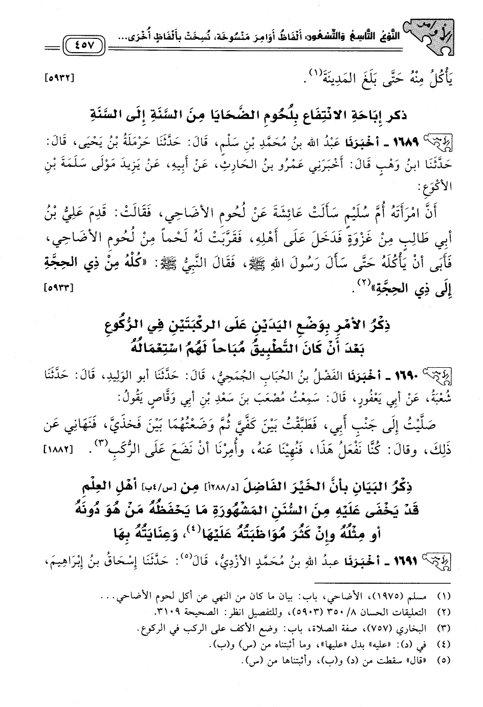 ١٦٨٩ - أَخبَرنا عَبْدُ اللهِ بْنُ مُحَمَّدِ بْنِ سَلْمٍ، قَالَ: حَدثنا حَرْمَلَةُ بْنُ يَحْيَى، قَالَ: حَدثنا ابْنُ وَهْبٍ، قَالَ: أَخْبَرَنِي عَمْرُو بْنُ الْحَارِثِ، عَنْ أَبِيهِ، عَنْ يَزِيدَ، مَوْلَى سَلَمَةَ بْنِ الأَكْوَعِ، أَنَّ امْرَأَتَهُ أُمَّ سُلَيْمٍ، سَأَلَتْ عَائِشَةَ عَنْ لُحُومِ الأَضَاحِيِّ فَقَالَتْ: قَدِمَ عَلِيُّ بْنُ أَبِي طَالِبٍ مِنْ غَزْوَةٍ، فَدَخَلَ عَلَى أَهْلِهِ، فَقَرَّبْتُ لَهُ لَحْمًا مِنْ لُحُومِ الأَضَاحِيِّ، فَأَبَى أَنْ يَأْكُلَهُ، حَتَّى سَأَلَ رَسُولَ اللهِ صَلى الله عَلَيه وسَلم، فَقَالَ النَّبِيُّ صَلى الله عَلَيه وسَلم: "كُلْهُ مِنْ ذِي الْحِجَّةِ، إِلَى ذِي الْحِجَّةِ". [٥٩٣٣]