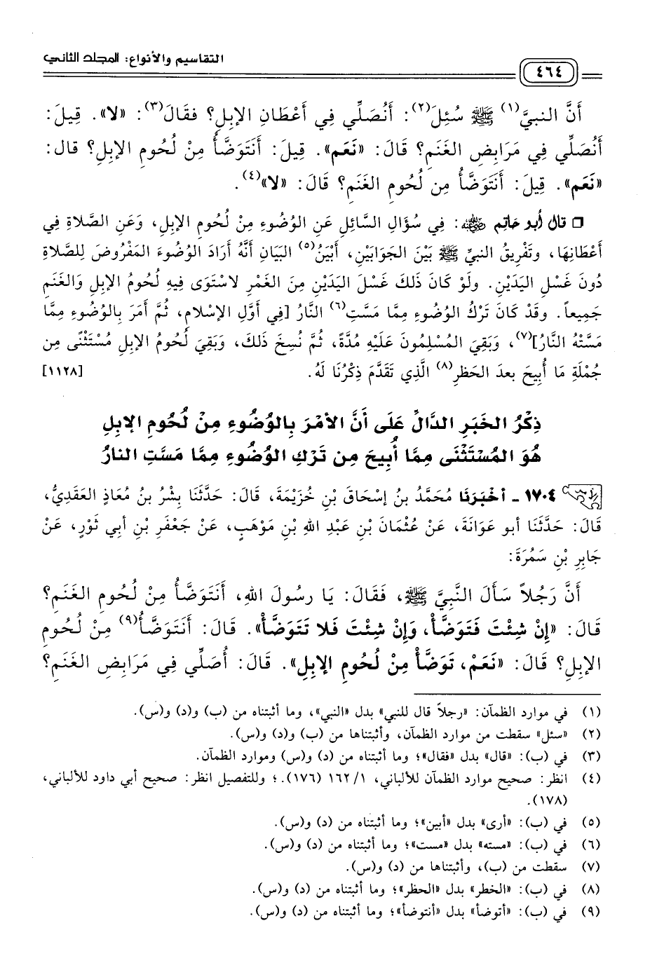 ١٧٠٤ - أَخبَرنا مُحَمَّدُ بْنُ إِسْحَاقَ بْنِ خُزَيْمَةَ، قَالَ: حَدثنا بِشْرُ بْنُ مُعَاذٍ الْعَقَدِيُّ، قَالَ: حَدثنا أَبُو عَوَانَةَ، عَنْ عُثْمَانَ بْنِ عَبْدِ اللهِ بْنِ مَوْهَبٍ، عَنْ جَعْفَرِ بْنِ أَبِي ثَوْرٍ، عَنْ جَابِرِ بْنِ سَمُرَةَ، أَنَّ رَجُلاً سَأَلَ النَّبِيَّ صَلى الله عَلَيه وسَلم، فَقَالَ: يَا رَسُولَ اللهِ، أَنَتَوَضَّأُ مِنْ لُحُومِ الْغَنَمِ؟ قَالَ: "إِنْ شِئْتَ فَتَوَضَّأْ، وَإِنْ شِئْتَ فَلَا تَتَوَضَّأْ"، قَالَ: أَنَتَوَضَّأُ مِنْ لُحُومِ الإِبِلِ؟ قَالَ: "نَعَمْ، تَوَضَّأْ مِنْ لُحُومِ الإِبِلِ"، قَالَ: أُصَلِّي فِي مَرَابِضِ الْغَنَمِ؟ قَالَ: "نَعَمْ"، قَالَ: أُصَلِّي فِي مَبَارِكِ الإِبِلِ؟ قَالَ: "لَا". [١١٥٦]