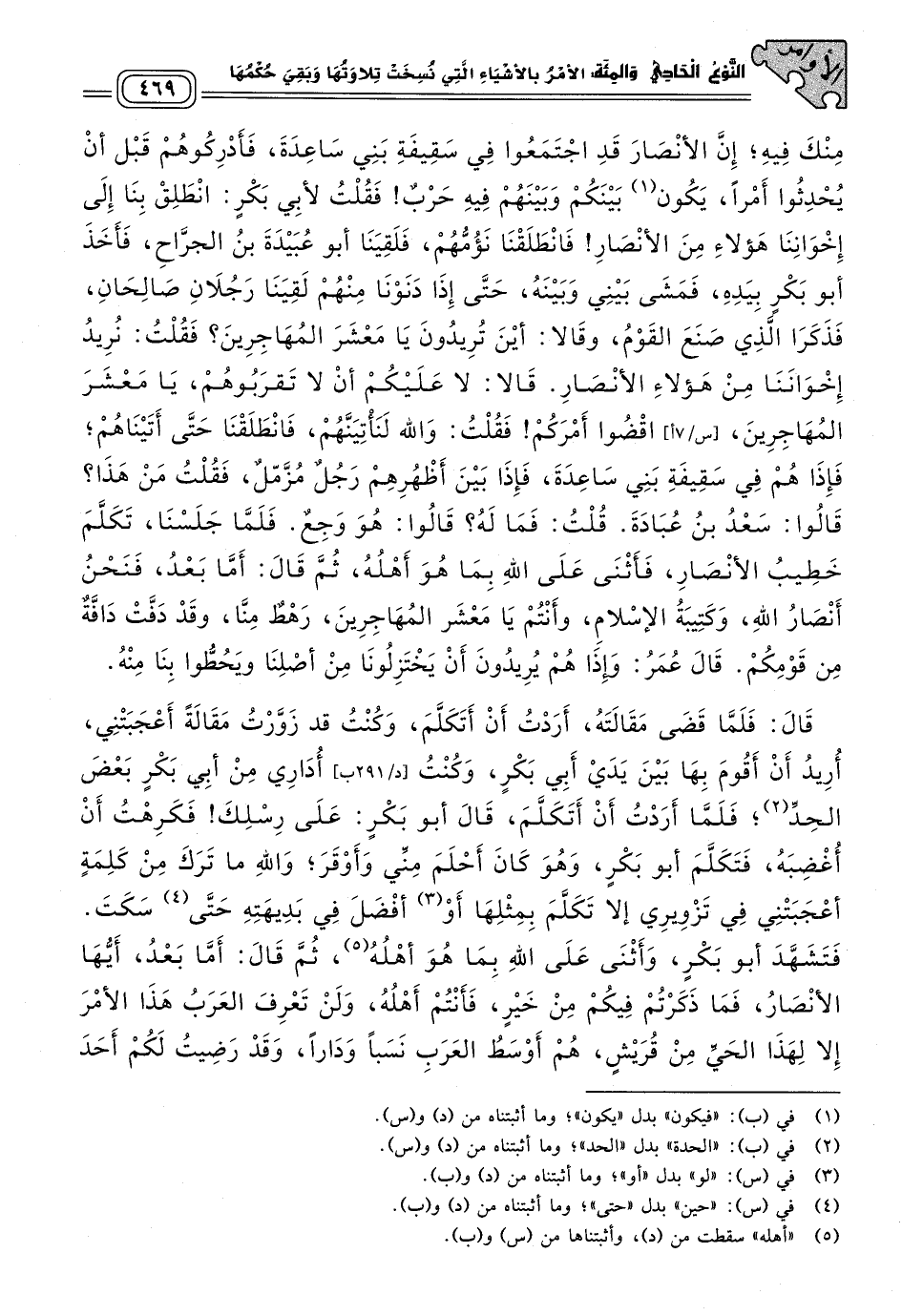 فَقُلْتُ: نُرِيدُ إِخْوَانَنَا مِنْ هَؤُلَاءِ الأَنْصَارِ، قَالَا: لَا عَلَيْكُمْ أَنْ لَا تَقْرَبُوهُمْ، يَا مَعْشَرَ الْمُهَاجِرِينَ، اقْضُوا أَمَرَكُمْ، فَقُلْتُ: وَاللهِ لَنَأْتِيَنَّهُمْ، فَانْطَلَقْنَا حَتَّى أَتَيْنَاهُمْ، فَإِذَا هُمْ فِي سَقِيفَةِ بَنِي سَاعِدَةَ، فَإِذَا بَيْنَ أَظْهُرِهِمْ رَجُلٌ مُزَّمِّلٌ، فَقُلْتُ: مَنْ هَذَا؟ قَالُوا: سَعْدُ بْنُ عُبَادَةَ، قُلْتُ: فَمَا لَهُ؟ قَالُوا: هُوَ وَجِعٌ، فَلَمَّا جَلَسْنَا، تَكَلَّمَ خَطِيبُ الأَنْصَارِ، فَأَثْنَى عَلَى اللهِ بِمَا هُوَ أَهْلُهُ، ثُمَّ قَالَ: أَمَّا بَعْدُ، فَنَحْنُ أَنْصَارُ اللهِ، وَكَتِيبَةُ الإِسْلَامِ، وَأَنْتُمْ يَا مَعْشَرَ الْمُهَاجِرِينَ، رَهْطٌ مِنَّا، وَقَدْ دَفَّتْ دَافَّةٌ مِنْ قَوْمِكُمْ، قَالَ عُمَرُ: وَإِذَا هُمْ يُرِيدُونَ أَنْ يَخْتَزِلُونَا مِنْ أَصْلِنَا وَيَحُطُّوا بِنَا مِنْهُ، قَالَ: فَلَمَّا قَضَى مَقَالَتَهُ، أَرَدْتُ أَنْ أَتَكَلَّمَ، وَكُنْتُ قَدْ زَوَّرْتُ مَقَالَةً أَعْجَبَتْنِي، أُرِيدُ أَنْ أَقُومَ بِهَا بَيْنَ يَدَيْ أَبِي بَكْرٍ، وَكُنْتُ أُدَارِي مِنْ أَبِي بَكْرٍ بَعْضَ الْحِدِّ، فَلَمَّا أَرَدْتُ أَنْ أَتَكَلَّمَ، قَالَ أَبُو بَكْرٍ: عَلَى رِسْلِكَ، فَكَرِهْتُ أَنْ أُغْضِبَهُ، فَتَكَلَّمَ أَبُو بَكْرٍ، وَهُوَ كَانَ أَحْلَمَ مِنِّي وَأَوْقَرَ، وَاللهِ مَا تَرَكَ مِنْ كَلِمَةٍ أَعْجَبَتْنِي فِي تَزْوِيرِي إِلَاّ تَكَلَّمَ بِمِثْلِهَا، أَوْ أَفْضَلَ فِي بَدِيهَتِهِ حَتَّى سَكَتَ، فَتَشَهَّدَ أَبُو بَكْرٍ، وَأَثْنَى عَلَى اللهِ بِمَا هُوَ أَهْلُهُ،