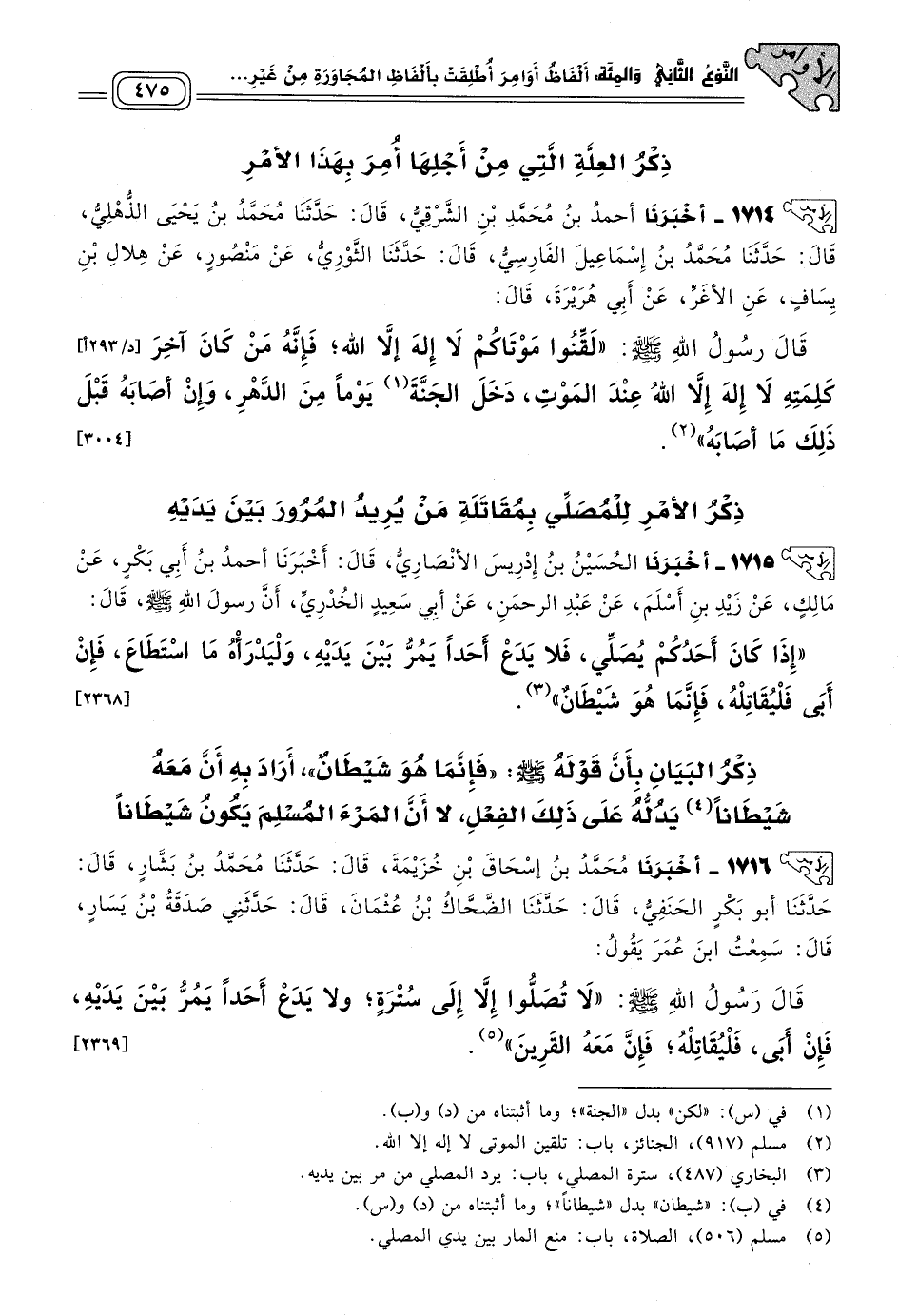 ١٧١٥ - أَخبَرنا الْحُسَيْنُ بْنُ إِدْرِيسَ الأَنْصَارِيُّ، قَالَ: أَخبَرنا أَحْمَدُ بْنُ أَبِي بَكْرٍ، عَنْ مَالِكٍ، عَنْ زَيْدِ بْنِ أَسْلَمَ، عَنْ عَبْدِ الرَّحْمَنِ، عَنْ أَبِي سَعِيدٍ الْخُدْرِيِّ، أَنَّ رَسُولَ اللهِ صَلى الله عَلَيه وسَلم قَالَ: "إِذَا كَانَ أَحَدُكُمْ يُصَلِّي فَلَا يَدَعْ أَحَدًا يَمُرُّ بَيْنَ يَدَيْهِ، وَلْيَدْرَأْهُ مَا اسْتَطَاعَ، فَإِنْ أَبَى فَلْيُقَاتِلْهُ، فَإِنَّمَا هُوَ شَيْطَانٌ". [٢٣٦٨]