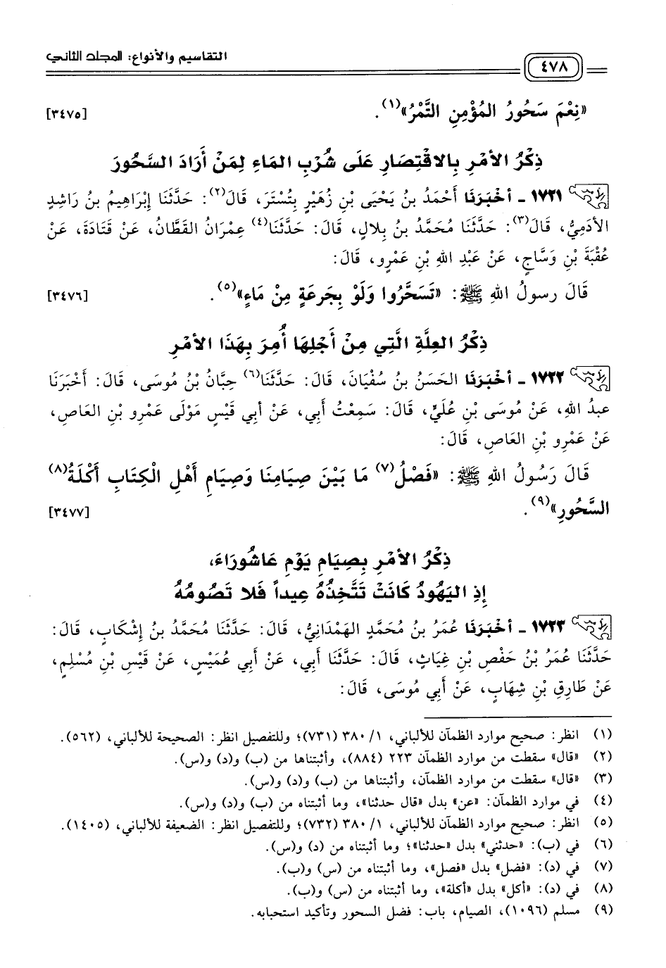 ١٧٢٢ - أَخبَرنا الْحَسَنُ بْنُ سُفْيَانَ، قَالَ: حَدَّثَنا حِبَّانُ بْنُ مُوسَى، قَالَ: أَخبَرنا عَبْدُ اللهِ، عَنْ مُوسَى بْنِ عُلَيٍّ، قَالَ: سَمِعْتُ أَبِي، عَنْ أَبِي قَيْسٍ، مَوْلَى عَمْرِو بْنِ الْعَاصِ، عَنْ عَمْرِو بْنِ الْعَاصِ، قَالَ: قَالَ رَسُولُ اللهِ صَلى الله عَلَيه وسَلم: "فَصْلُ مَا بَيْنَ صِيَامِنَا وَصِيَامِ أَهْلِ الْكِتَابِ أَكْلَةُ السَّحُورِ". [٣٤٧٧]