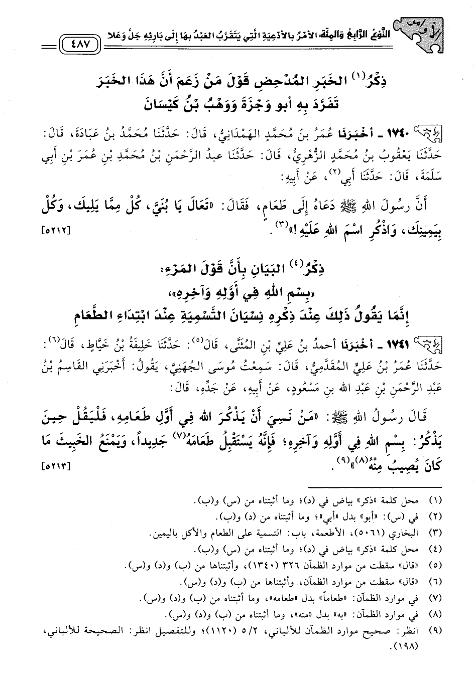 ١٧٤٠ - أَخبَرنا عُمَرُ بْنُ مُحَمَّدٍ الْهَمْدَانِيُّ، قَالَ: حَدثنا مُحَمَّدُ بْنُ عَبَادَةَ، قَالَ: حَدثنا يَعْقُوبُ بْنُ مُحَمَّدٍ الزُّهْرِيُّ، قَالَ: حَدثنا عَبْدُ الرَّحْمَنِ بْنُ مُحَمَّدِ بْنِ عُمَرَ بْنِ أَبِي سَلَمَةَ، قَالَ: حَدثنا أَبِي، عَنْ أَبِيهِ، أَنَّ رَسُولَ اللهِ صَلى الله عَلَيه وسَلم دَعَاهُ إِلَى طَعَامٍ، فَقَالَ: "تَعَالَ يَا بُنَيَّ، كُلْ مِمَّا يَلِيكَ، وَكُلْ بِيَمِينِكَ، وَاذْكُرِ اسْمَ اللهِ عَلَيْهِ". [٥٢١٢]