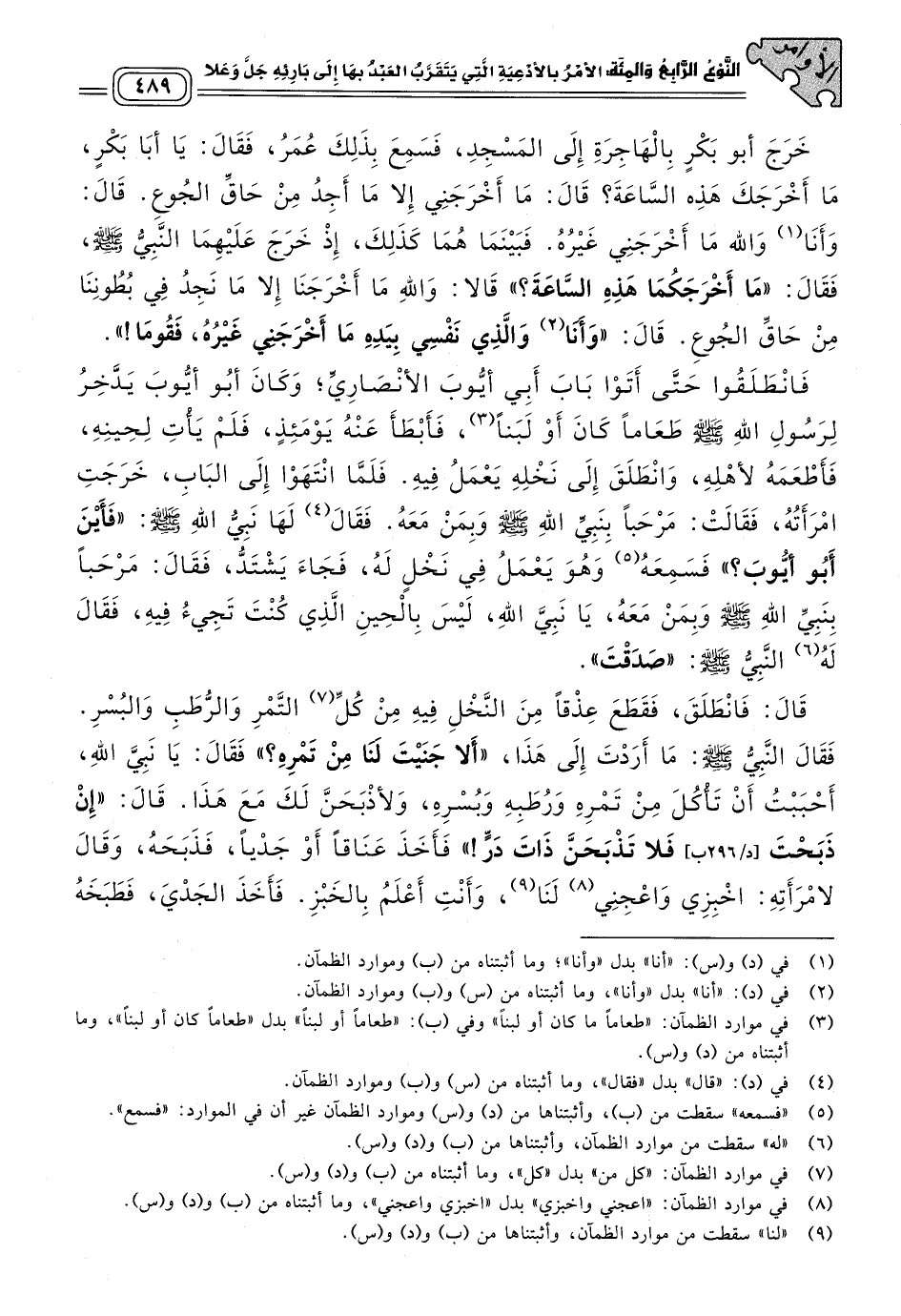 فَلَمَّا انْتَهَوْا إِلَى الْبَابِ خَرَجَتِ امْرَأَتُهُ، فَقَالَتْ: مَرْحَبًا بِنَبِيِّ اللهِ صَلى الله عَلَيه وسَلم وَبِمَنْ مَعَهُ، فَقَالَ لَهَا نَبِيُّ اللهِ صَلى الله عَلَيه وسَلم: "فَأَيْنَ أَبُو أَيُّوبَ؟ " فَسَمِعَهُ وَهُوَ يَعْمَلُ فِي نَخْلٍ لَهُ، فَجَاءَ يَشْتَدُّ، فَقَالَ: مَرْحَبًا بِنَبِيِّ اللهِ صَلى الله عَلَيه وسَلم وَبِمَنْ مَعَهُ، يَا نَبِيَّ اللهِ، لَيْسَ بِالْحِينِ الَّذِي كُنْتَ تَجِيءُ فِيهِ، فَقَالَ لَهُ النَّبِيُّ صَلى الله عَلَيه وسَلم: "صَدَقْتَ". قَالَ: فَانْطَلَقَ فَقَطَعَ عِذْقًا مِنَ النَّخْلِ فِيهِ مِنْ كُلِّ التَّمْرِ وَالرُّطَبِ وَالْبُسْرِ، فَقَالَ النَّبِيُّ صَلى الله عَلَيه وسَلم: "مَا أَرَدْتَ إِلَى هَذَا أَلَا جَنَيْتَ لَنَا مِنْ تَمْرِهِ"، فَقَالَ: يَا نَبِيَّ اللهِ أَحْبَبْتُ أَنْ تَأْكُلَ مِنْ تَمْرِهِ وَرُطَبِهِ وَبُسْرِهِ، وَلأَذْبَحَنَّ لَكَ مَعَ هَذَا، قَالَ: "إِنْ ذَبَحْتَ فَلَا تَذْبَحَنَّ ذَاتَ دَرٍّ"، فَأَخَذَ عَنَاقًا، أَوْ جَدْيًا فَذَبَحَهُ، وَقَالَ لاِمْرَأَتِهِ: اخْبِزِي وَاعْجِنِي لَنَا، وَأَنْتِ أَعْلَمُ بِالْخَبْزِ، فَأَخَذَ الْجَدْيَ فَطَبَخَهُ وَشَوَى بطنه، فَلَمَّا أَدْرَكَ الطَّعَامُ، وُضِعَ بَيْنَ يَدَيِ النَّبِيِّ صَلى الله عَلَيه وسَلم وَأَصْحَابِهِ، فَأَخَذَ مِنَ الْجَدْيِ فَجَعَلَهُ فِي رَغِيفٍ، فَقَالَ: "يَا أَبَا أَيُّوبَ أَبْلِغْ بِهَذَا فَاطِمَةَ، فَإِنَّهَا لَمْ تُصِبْ مِثْلَ هَذَا مُنْذُ أَيَّامٍ".