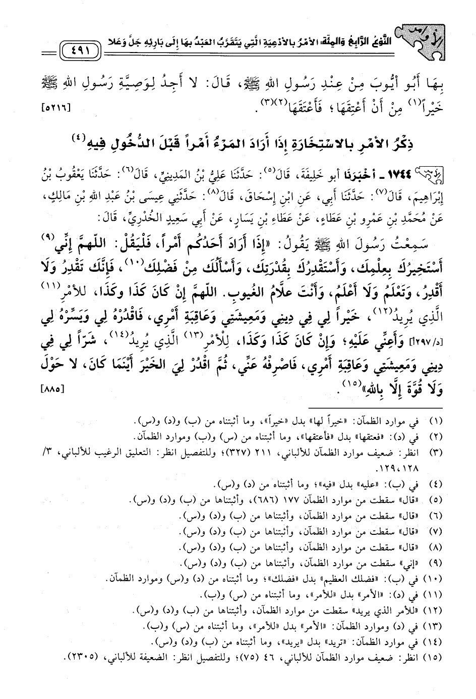 ١٧٤٤ - أَخبَرنا أَبُو خَلِيفَةَ، قَالَ: حَدثنا عَلِيُّ بْنُ الْمَدِينِيِّ، قَالَ: حَدثنا يَعْقُوبُ بْنُ إِبْرَاهِيمَ، قَالَ: حَدثنا أَبِي، عَنِ ابْنِ إِسْحَاقَ، قَالَ: حَدَّثَنِي عِيسَى بْنُ عَبْدِ اللهِ بْنِ مَالِكٍ، عَنْ مُحَمَّدِ بْنِ عَمْرِو بْنِ عَطَاءٍ، عَنْ عَطَاءِ بْنِ يَسَارٍ، عَنْ أَبِي سَعِيدٍ الْخُدْرِيِّ، قَالَ: سَمِعْتُ رَسُولَ اللهِ صَلى الله عَلَيه وسَلم، يَقُولُ: "إِذَا أَرَادَ أَحَدُكُمْ أَمْرًا فَلْيَقُلِ: اللهُمَّ إِنِّي أَسْتَخِيرُكَ بِعِلْمِكَ، وَأَسْتَقْدِرُكَ بِقُدْرَتِكَ، وَأَسْأَلُكَ مِنْ فَضْلِكَ، فَإِنَّكَ تَقْدِرُ وَلَا أَقْدِرُ، وَتَعْلَمُ وَلَا أَعْلَمُ، وَأَنْتَ عَلَاّمُ الْغُيُوبِ، اللهُمَّ إِنْ كَانَ كَذَا وَكَذَا، لِلأَمْرِ الَّذِي يُرِيدُ، خَيْرًا لِي فِي دِينِي وَمَعِيشَتِي وَعَاقِبَةِ أَمْرِي، فَاقْدُرْهُ لِي وَيَسِّرْهُ لِي وَأَعِنِّي عَلَيْهِ، وَإِنْ كَانَ كَذَا وَكَذَا، لِلأَمْرِ الَّذِي يُرِيدُ، شَرًّا لِي فِي دِينِي وَمَعِيشَتِي وَعَاقِبَةِ أَمْرِي، فَاصْرِفْهُ عَنِّي، ثُمَّ اقْدُرْ لِيَ الْخَيْرَ أَيْنَمَا كَانَ، لَا حَوْلَ وَلَا قُوَّةَ إِلَاّ بِاللهِ". [٨٨٥]