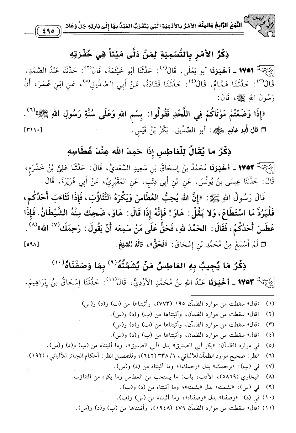 ١٧٥٣ - أَخبَرنا عَبْدُ اللهِ بْنُ مُحَمَّدٍ الأَزْدِيُّ، قَالَ: حَدثنا إِسْحَاقُ بْنُ إِبْرَاهِيمَ، قَالَ: حَدثنا يَحْيَى بْنُ آدَمَ، قَالَ: حَدثنا إِسْرَائِيلُ، عَنْ مَنْصُورٍ، عَنْ هِلَالِ بْنِ يَسَافٍ، قَالَ: كُنَّا مَعَ سَالِمِ بْنِ عُبَيْدٍ فِي غَزَاةٍ، فَعَطَسَ رَجُلٌ مِنَ الْقَوْمِ، فقَالَ: السَّلَامُ عَلَيْكُمْ، فقَالَ سَالِمٌ: السَّلَامُ عَلَيْكَ وَعَلَى أُمِّكَ، فَوَجَدَ الرَّجُلُ فِي نَفْسِهِ، فقَالَ لَهُ سَالِمٌ: كَأَنَّكَ وَجَدْتَ فِي نَفْسِكَ؟ فقَالَ: مَا كُنْتُ أُحِبُّ أَنْ تَذْكُرَ أُمِّي بِخَيْرٍ وَلَا بِشَرٍّ، فقَالَ سَالِمٌ: كُنَّا مَعَ رَسُولِ اللهِ صَلى الله عَلَيه وسَلم فِي سَفَرٍ، فَعَطَسَ رَجُلٌ من القوم، فقَالَ: السَّلَامُ عَلَيْكُمْ، فقَالَ رَسُولُ اللهِ صَلى الله عَلَيه وسَلم: "عَلَيْكَ وَعَلَى أُمِّكَ، إِذَا عَطَسَ أَحَدُكُمْ فَلْيَقُل: الْحَمْدُ للهِ عَلَى كُلِّ حَالٍ"، أَوْ قَالَ: "الْحَمْدُ للهِ رَبِّ الْعَالَمِينَ، وَلْيُقَلْ لَهُ: يَرْحَمُكَ اللهُ، وَلْيَقُلْ هُوَ: يَغْفِرُ اللهُ لَكُمْ". [٥٩٩]