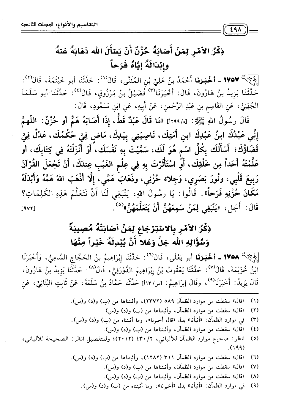 ١٧٥٧ - أَخبَرنا أَحْمَدُ بْنُ عَلِيِّ بْنِ الْمُثَنَّى، قَالَ: حَدثنا أَبُو خَيْثَمَةَ، قَالَ: حَدثنا يَزِيدُ بْنُ هَارُونَ، قَالَ: أَخبَرنا فُضَيْلُ بْنُ مَرْزُوقٍ، قَالَ: حَدثنا أَبُو سَلَمَةَ الْجُهَنِيُّ، عَنِ الْقَاسِمِ بْنِ عَبْدِ الرَّحْمَنِ، عَنْ أَبِيهِ، عَنِ ابْنِ مَسْعُودٍ، قَالَ: قَالَ رَسُولُ اللهِ صَلى الله عَلَيه وسَلم: "مَا قَالَ عَبْدٌ قَطُّ، إِذَا أَصَابَهُ هَمٌّ، أَوْ حُزْنٌ: اللهُمَّ إِنِّي عَبْدُكَ ابْنُ عَبْدِكَ ابْنُ أَمَتِكَ، نَاصِيَتِي بِيَدِكَ، مَاضٍ فِيَّ حُكْمُكَ، عَدْلٌ فِيَّ قَضَاؤُكَ، أَسْأَلُكَ بِكُلِّ اسْمٍ هُوَ لَكَ، سَمَّيْتَ بِهِ نَفْسَكَ، أَوْ أَنْزَلْتَهُ فِي كِتَابِكَ، أَوْ عَلَّمْتَهُ أَحَدًا مِنْ خَلْقِكَ، أَوِ اسْتَأْثَرْتَ بِهِ فِي عِلْمِ الْغَيْبِ عِنْدَكَ، أَنْ تَجْعَلَ الْقُرْآنَ رَبِيعَ قَلْبِي، وَنُورَ بَصَرِي، وَجِلَاءَ حُزْنِي، وَذَهَابَ هَمِّي، إِلَاّ أَذْهَبَ اللهُ هَمَّهُ وَأَبْدَلَهُ مَكَانَ حُزْنِهِ فَرَحًا"، قَالُوا: يَا رَسُولَ اللهِ، يَنْبَغِي لَنَا أَنْ نَتَعَلَّمَ هَذِهِ الْكَلِمَاتِ؟ قَالَ: "أَجَلْ، يَنْبَغِي لِمَنْ سَمِعَهُنَّ أَنْ يَتَعَلَّمَهُنَّ". [٩٧٢]