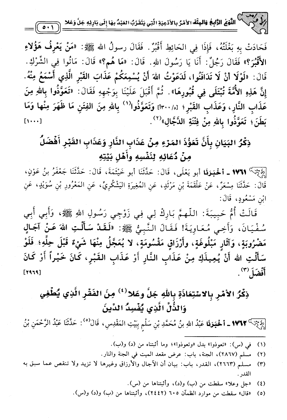 ١٧٦١ - أَخبَرنا أَبُو يَعْلَى، قَالَ: حَدثنا أَبُو خَيْثَمَةَ، قَالَ: حَدثنا جَعْفَرُ بْنُ عَوْنٍ، قَالَ: حَدثنا مِسْعَرٌ، عَنْ عَلْقَمَةَ بْنِ مَرْثَدٍ، عَنِ الْمُغِيرَةِ الْيَشْكُرِيِّ، عَنِ الْمَعْرُورِ بْنِ سُوَيْدٍ، عَنِ ابْنِ مَسْعُودٍ، قَالَ: قَالَتْ أُمُّ حَبِيبَةَ، اللهُمَّ بَارِكَ لِي فِي زَوْجِي رَسُولِ اللهِ صَلى الله عَلَيه وسَلم، وَأَبِي أَبِي سُفْيَانَ، وَأَخِي مُعَاوِيَةَ، فَقَالَ النَّبِيُّ صَلى الله عَلَيه وسَلم: "لَقَدْ سَأَلْتِ اللهَ عَنْ آجَالٍ مَضْرُوبَةٍ، وَآثَارٍ مَبْلُوغَةٍ، وَأَرْزَاقٍ مَقْسُومَةٍ، لَا يُعَجَّلُ مِنْهَا شَيْءٌ قَبْلَ حِلِّهِ، فَلَوْ سَأَلْتِ اللهَ أَنْ يُعِيذَكِ مِنْ عَذَابِ النَّارِ أَوْ عَذَابِ الْقَبْرِ كَانَ خَيْرًا، أَوْ كَانَ أَفْضَلَ". [٢٩٦٩]