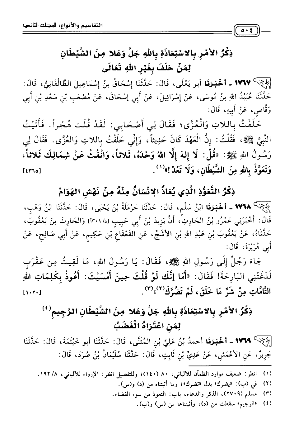 ١٧٦٧ - أَخبَرنا أَبُو يَعْلَى، قَالَ: حَدثنا إِسْحَاقُ بْنُ إِسْمَاعِيلَ الطَّالْقَانِيُّ، قَالَ: حَدثنا عُبَيْدُ اللهِ بْنُ مُوسَى، عَنْ إِسْرَائِيلَ، عَنْ أَبِي إِسْحَاقَ، عَنْ مُصْعَبِ بْنِ سَعْدِ بْنِ أَبِي وَقَّاصٍ، عَنْ أَبِيهِ قَالَ: حَلَفْتُ بِاللَاّتِ وَالْعُزَّى، فَقَالَ لِي أَصْحَابِي: لَقَدْ قُلْتَ هُجْرًا، فَأَتَيْتُ النَّبِيَّ صَلى الله عَلَيه وسَلم، فَقُلْتُ: إِنَّ الْعَهْدَ كَانَ حَدِيثًا، وَإِنِّي حَلَفْتُ بِاللَاّتِ وَالْعُزَّى، فَقَالَ لِي رَسُولُ اللهِ صَلى الله عَلَيه وسَلم: "قُلْ لَا إِلَهَ إِلَاّ اللهُ وَحْدَهُ ثَلَاثًا، وَانْفُثْ عَنْ شِمَالِكَ ثَلَاثًا، وَتَعَوَّذْ بِاللهِ مِنَ الشَّيْطَانِ، وَلَا تَعُدْ". [٤٣٦٥]