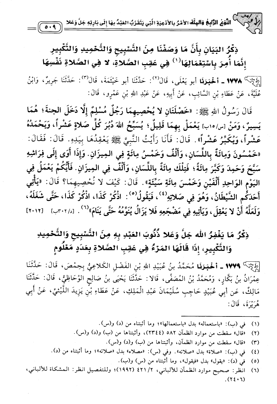 ذِكْرُ الْبَيَانِ بِأَنَّ مَا وَصَفْنَا مِنَ التَّسْبِيحِ، وَالتَّحْمِيدِ، وَالتَّكْبِيرِ، إِنَّمَا أُمِرَ بِاسْتِعْمَالِهَا فِي عَقِبِ الصَّلَاةِ لَا فِي الصَّلَاةِ نَفْسِهَا.