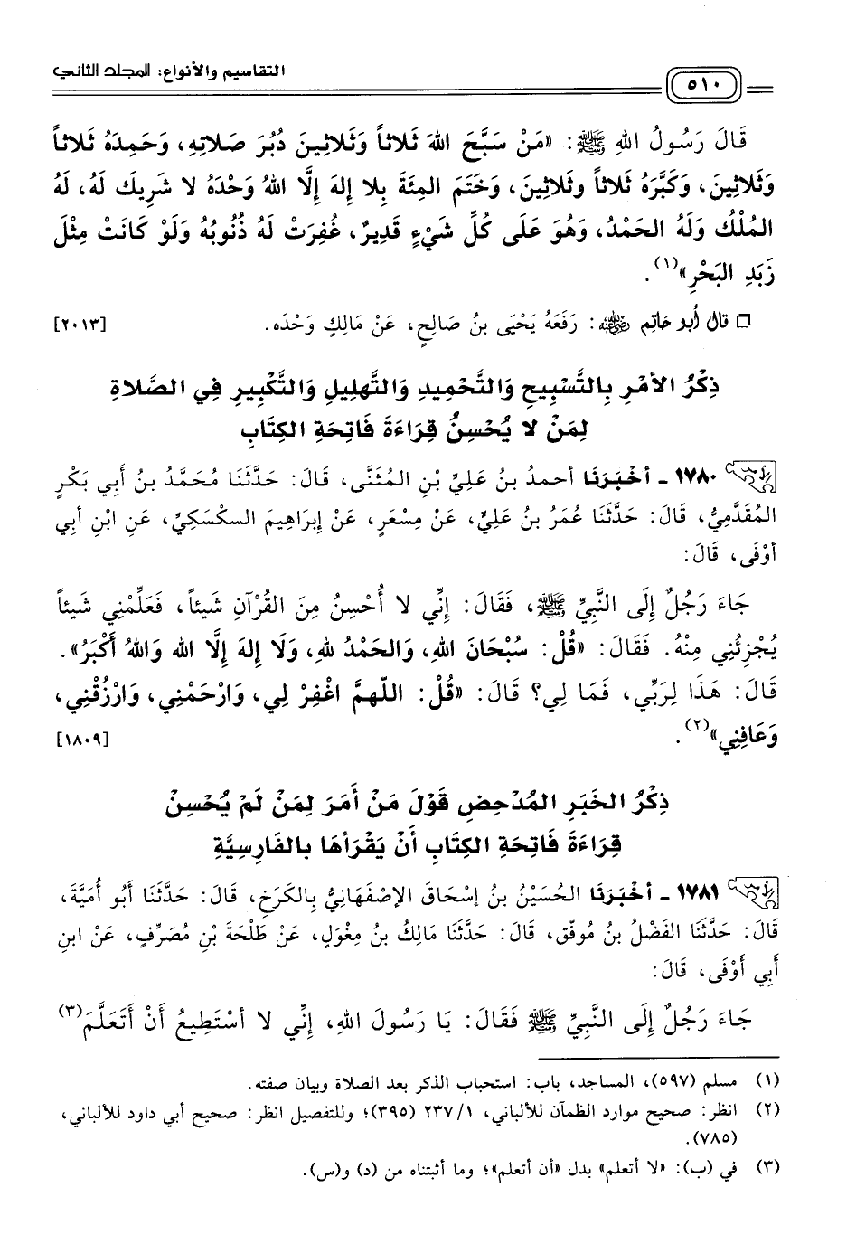 ١٧٨١ - أَخبَرنا الْحُسَيْنُ بْنُ إِسْحَاقَ الإصْفَهَانِيُّ بِالْكَرْخِ، قَالَ: حَدثنا أَبُو أُمَيَّةَ، قَالَ: حَدثنا الْفَضْلُ بْنُ مُوَفَّقٍ، قَالَ: حَدثنا مَالِكُ بْنُ مِغْوَلٍ، عَنْ طَلْحَةَ بْنِ مُصَرِّفٍ، عَنِ ابْنِ أَبِي أَوْفَى، قَالَ: جَاءَ رَجُلٌ إِلَى النَّبِيِّ صلى الله عليه وسلم فَقَالَ: يَا رَسُولَ اللهِ، إِنِّي لَا أَسْتَطِيعُ أَنْ أَتَعَلَّمَ الْقُرْآنَ، فَعَلِّمْنِي مَا يُجْزِئُنِي مِنَ الْقُرْآنِ، قَالَ: "قُلْ: سُبْحَانَ اللهِ، وَالْحَمْدُ للهِ، وَلَا إِلَهَ إِلَاّ اللهُ، وَاللهُ أَكْبَرُ، وَلَا حَوْلَ وَلَا قُوَّةَ إِلَاّ بِاللهِ". قَالَ: هَذَا للهِ، فَمَا لِي؟ قَالَ: "قُلْ: رَبِّ اغْفِرْ لِي، وَارْحَمْنِي، وَاهْدِنِي، وَعَافِنِي، وَارْزُقْنِي"، فَقَالَ رَسُولُ اللهِ صلى الله عليه وسلم: "لَقَدْ مَلأَ يَدَيْهِ خَيْرًا". [١٨١٠]