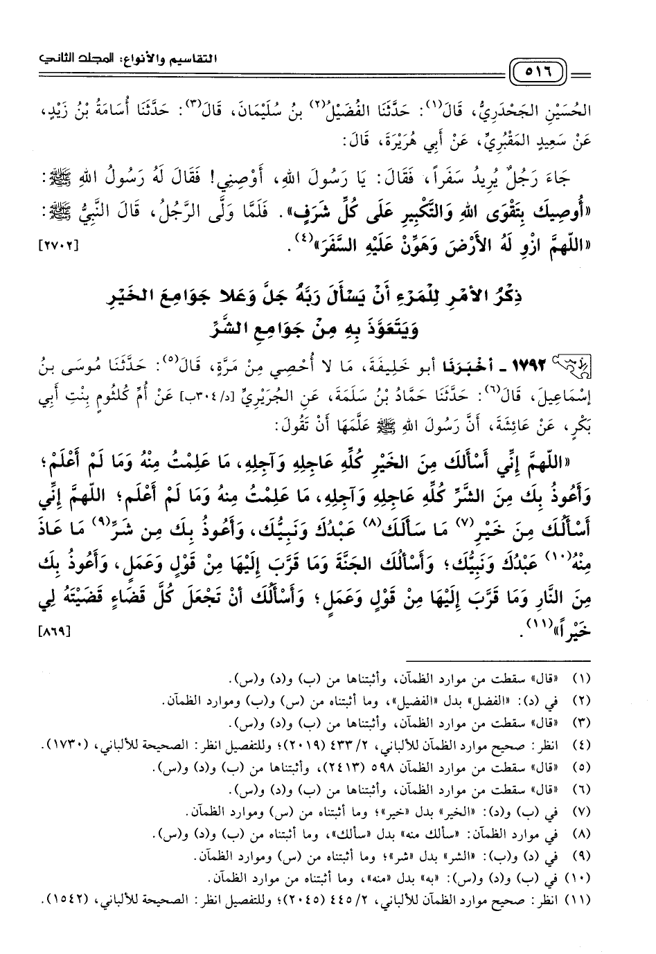 ١٧٩٢ - أَخبَرنا أَبُو خَلِيفَةَ، مَا لَا أُحْصِي مِنْ مَرَّةٍ، قَالَ: حَدثنا مُوسَى بْنُ إِسْمَاعِيلَ، قَالَ: حَدثنا حمادُ بْنُ سَلَمَةَ، عَنِ الْجُرَيْرِيِّ، عَنْ أُمِّ كُلْثُومٍ بِنْتِ أَبِي بَكْرٍ، عَنْ عَائِشَةَ، أَنَّ رَسُولَ اللهِ صَلى الله عَلَيه وسَلم عَلَّمَهَا أَنْ تَقُولَ: "اللهُمَّ إِنِّي أَسْأَلُكَ مِنَ الْخَيْرِ كُلِّهِ عَاجِلِهِ وَآجِلِهِ، مَا عَلِمْتُ مِنْهُ وَمَا لَمْ أَعْلَمُ، وَأَعُوذُ بِكَ مِنَ الشَّرِّ كُلِّهِ عَاجِلِهِ وَآجِلِهِ، مَا عَلِمْتُ مِنْهُ وَمَا لَمْ أَعْلَمُ، اللهُمَّ إِنِّي أَسْأَلُكَ مِنَ خَيْرِ مَا سَأَلَكَ عَبْدُكَ وَنَبِيُّكَ، وَأَعُوذُ بِكَ مِنَ شَرِّ مَا عَاذَ منه عَبْدُكَ وَنَبِيُّكَ، وَأَسْأَلُكَ الْجَنَّةَ وَمَا قَرَّبَ إِلَيْهَا مِنْ قَوْلٍ وَعَمَلٍ، وَأَعُوذُ بِكَ مِنَ النَّارِ وَمَا قَرَّبَ إِلَيْهَا مِنْ قَوْلٍ وَعَمَلٍ، وَأَسْأَلُكَ أَنْ تَجْعَلَ كُلَّ قَضَاءٍ قَضَيْتَهُ لِي خَيْرًا". [٨٦٩]
