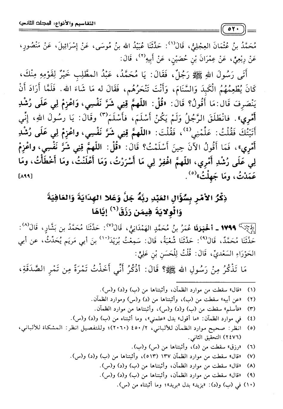 ١٧٩٩ - أَخبَرنا عُمَرُ بْنُ مُحَمَّدٍ الْهَمْدَانِيُّ، قَالَ: حَدثنا مُحَمَّدُ بْنُ بَشَّارٍ، قَالَ: حَدثنا مُحَمَّدٌ، قَالَ: حَدثنا شُعْبَةُ، قَالَ: سَمِعْتُ بُرَيْدَ بْنَ أَبِي مَرْيَمَ يُحَدِّثُ، عَنْ أَبِي الْحَوْرَاءِ السَّعْدِيِّ، قَالَ: قُلْتُ لِلْحَسَنِ بْنِ عَلِيٍّ: مَا تَذْكُرُ مِنْ رَسُولِ اللهِ صَلى الله عَلَيه وسَلم؟ قَالَ: أَذْكُرُ أَنِّي أَخَذْتُ تَمْرَةً مِنْ تَمْرِ الصَّدَقَةِ، فَجَعَلْتُهَا فِي فِيَّ، فَانْتَزَعَهَا بِلُعَابِهَا، فَطَرَحَهَا فِي التَّمْرِ، وَكَانَ يُعَلِّمُنَا هَذَا الدُّعَاءَ: "اللهُمَّ اهْدِنِي فِيمَنْ هَدَيْتَ، وَعَافِنِي فِيمَنْ عَافَيْتَ، وَتَوَلَّنِي فِيمَنْ تَوَلَّيْتَ، وَبَارِكْ لِي فِيمَا أَعْطَيْتَ، وَقِنِي شَرَّ مَا قَضَيْتَ، إِنَّكَ تَقْضِي وَلَا يُقْضَى عَلَيْكَ، إِنَّهُ لَا يَذِلُّ مَنْ وَالَيْتَ"، قَالَ شُعْبَةُ: وَأَظُنُّهُ قَالَ: "تَبَارَكْتَ وَتَعَالَيْتَ".