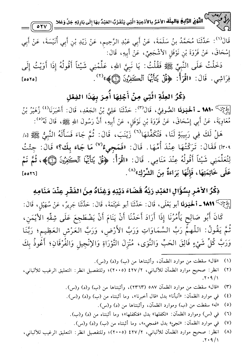 ١٨١٠ - أَخبَرنا الصُّوفِيُّ، قَالَ: حَدثنا عَلِيُّ بْنُ الْجَعْدِ، قَالَ: أَخبَرنا زُهَيْرُ بْنُ مُعَاوِيَةَ، عَنْ أَبِي إِسْحَاقَ، عَنْ فَرْوَةَ بْنِ نَوْفَلٍ، عَنْ أَبِيهِ، أَنَّ رَسُولَ اللهِ صَلى الله عَلَيه وسَلم قَالَ له: "هَلْ لَكَ فِي رَبِيبَةٍ لَنَا، فَتُكَفِّلهَا زَيْنَبَ؟ قَالَ: ثُمَّ جَاءَ فَسَأَلَهُ النَّبِيُّ صَلى الله عَلَيه وسَلم، فَقَالَ: تَرَكْتُهَا عِنْدَ أُمِّهَا، قَالَ: "فَمَجِيءٌ مَا جَاءَ بِكَ؟ " قَالَ: جِئْتُ لِتُعَلِّمَنِي شَيْئًا أَقُولُهُ عِنْدَ مَنَامِي، قَالَ: "اقْرَأْ: {قُلْ يَا أَيُّهَا الْكَافِرُونَ}، ثُمَّ نَمْ عَلَى خَاتِمَتِهَا، فَإِنَّهَا بَرَاءَةٌ مِنَ الشِّرْكِ". [٥٥٢٦]