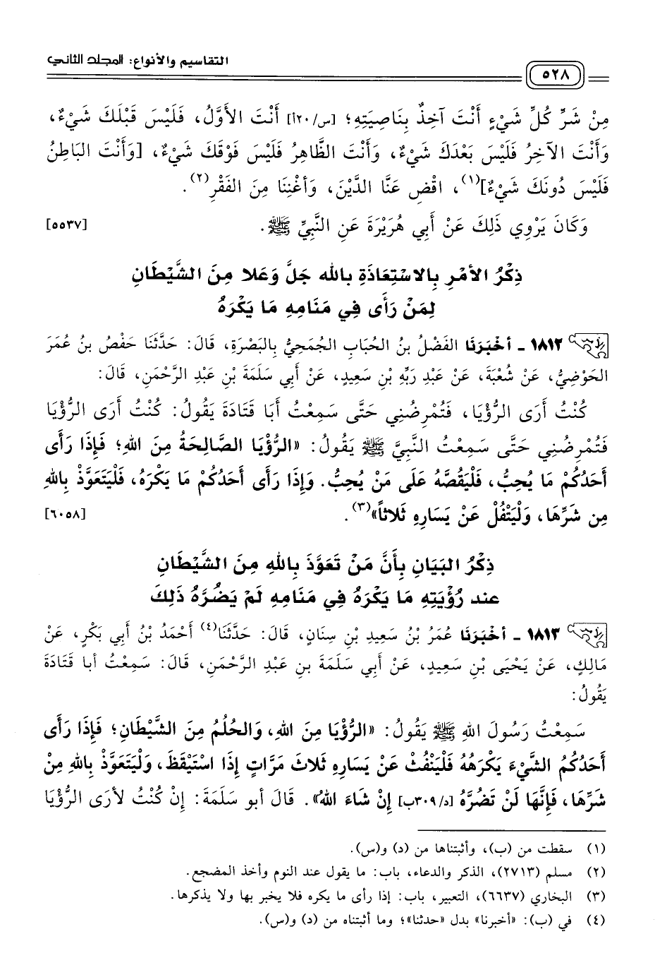 ذِكْرُ الأَمْرِ بِالاِسْتِعَاذَةِ بِاللهِ جَلَّ وَعَلَا مِنَ الشَّيْطَانِ لِمَنْ رَأَى فِي مَنَامِهِ مَا يَكْرَهُ.