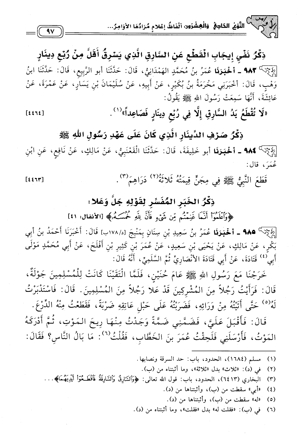 ٩٨٣ - أَخبَرنا عُمَرُ بْنُ مُحَمَّدٍ الْهَمْدَانِيُّ، قَالَ: حَدثنا أَبُو الرَّبِيعِ، قَالَ: حَدثنا ابْنُ وَهْبٍ، قَالَ: أَخْبَرَنِي مَخْرَمَةُ بْنُ بُكَيْرٍ، عَنْ أَبِيهِ، عَنْ سُلَيْمَانَ بْنِ يَسَارٍ، عَنْ عَمْرَةَ، عَنْ عَائِشَةَ، أَنَّهَا سَمِعَتْ رَسُولَ اللهِ صَلى الله عَلَيه وسَلم يَقُولُ: "لَا تُقْطَعُ يَدُ السَّارِقِ إِلَاّ فِي رُبْعِ دِينَارٍ فَصَاعِدًا". [٤٤٦٤]